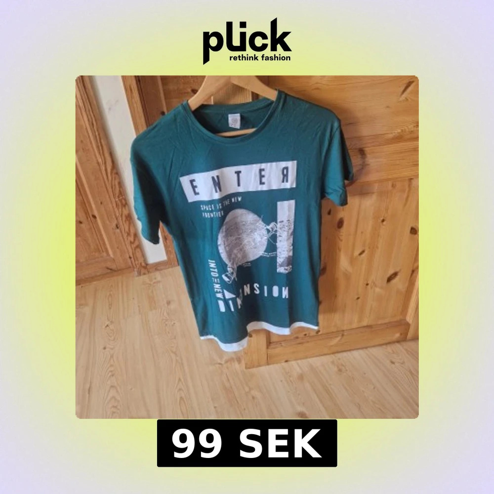 Säljer en grön t-shirt från Lindex med coolt vitt tryck framtill där det står 'ENTER' och motiv av en planet. T-shirten har rund hals och vita detaljer vid ärmslut och nederkant. Perfekt för dig som gillar rymdtema!