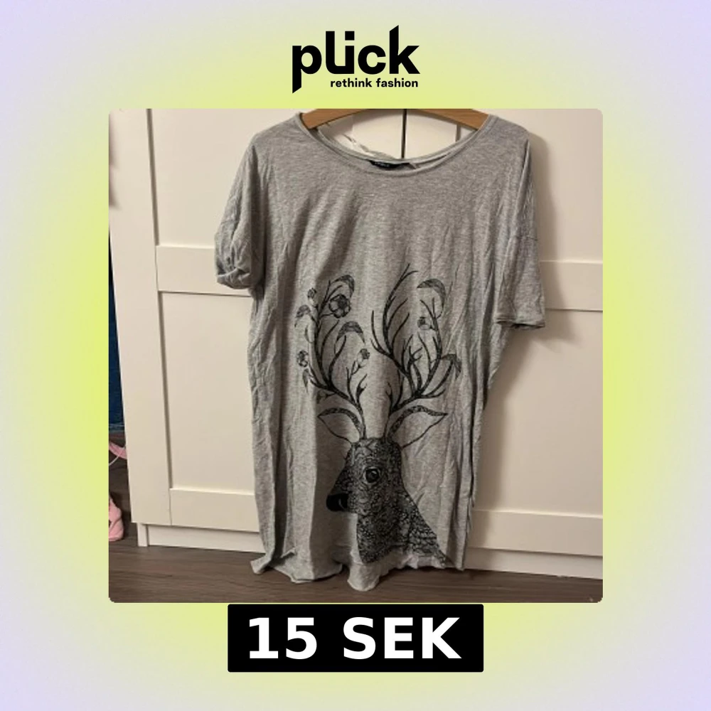 Säljer en grå t-shirt från Lindex med ett stort svart hjortmotiv på framsidan. T-shirten har korta ärmar och en rund halsringning. Kan användas som nattlinne har aldrig använts