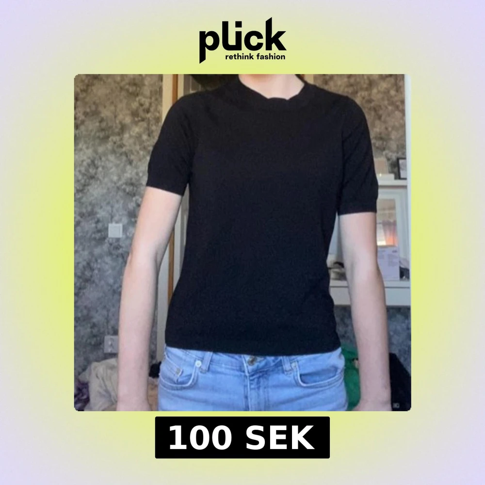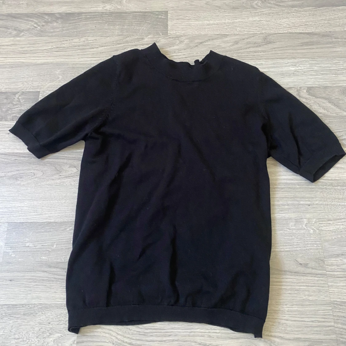 En svart T-shirt med tjockare material och ”hög hals” materialet känns mjukt och bekvämt storleken är xs men funkar också som s💝 Perfekt basplagg att ha i garderoben.