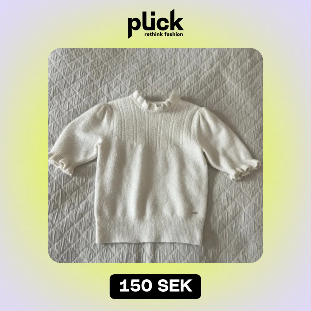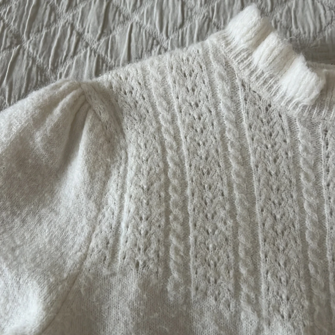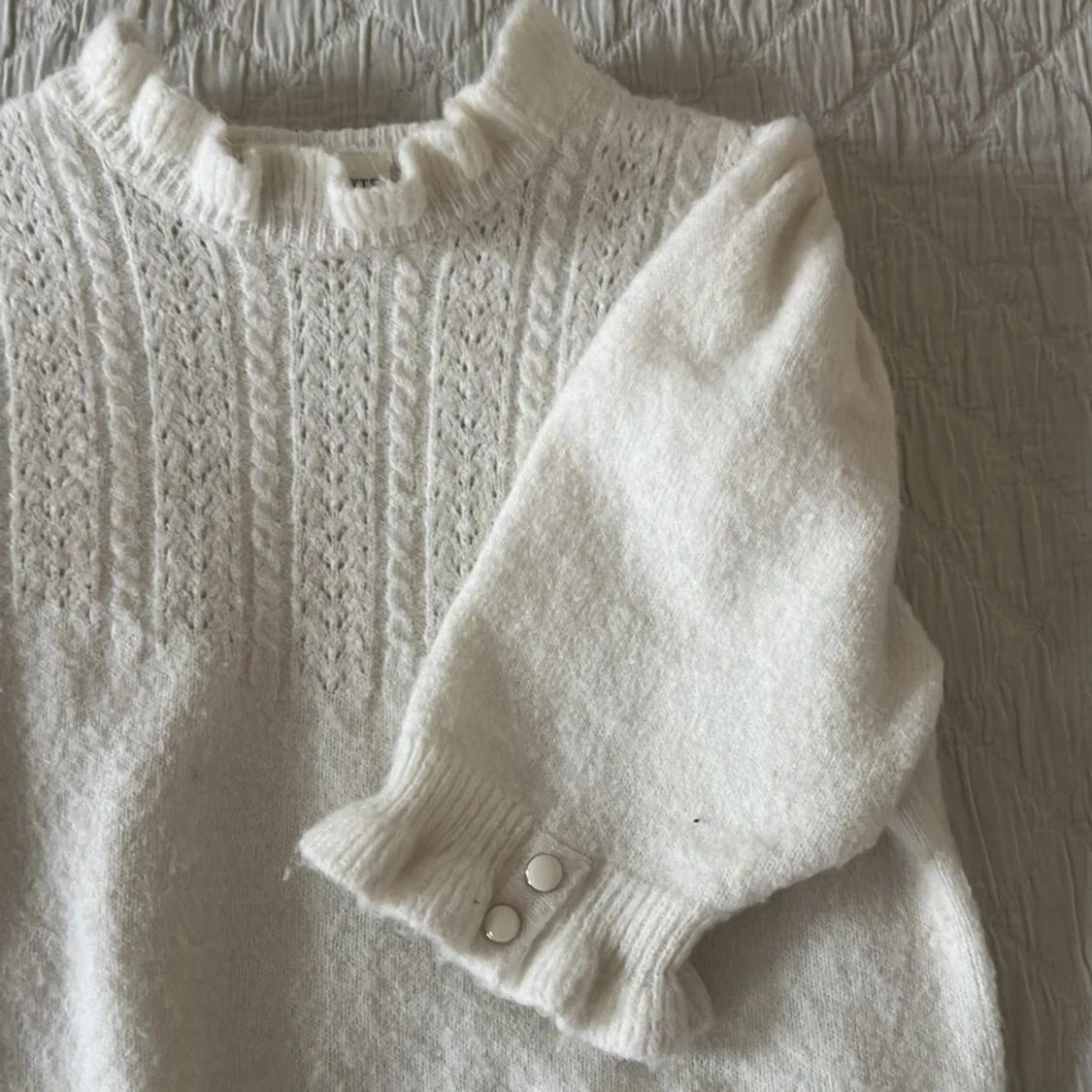 En stickad krämfärgad T-shirt med puffärm från Holly and Whyte (Lindex). Fint stickat mönster på bröstkorgen.