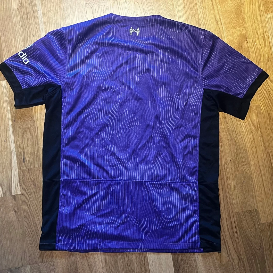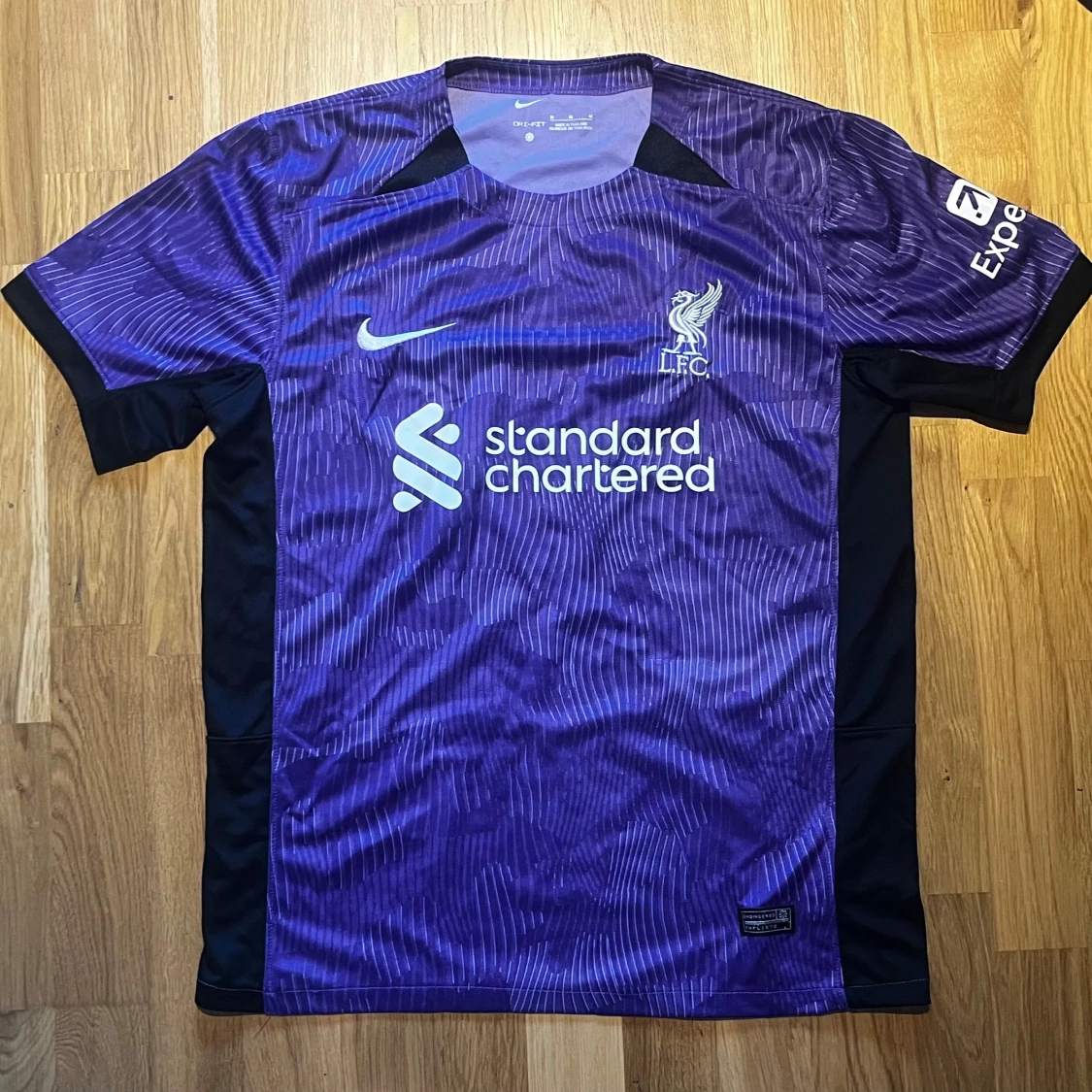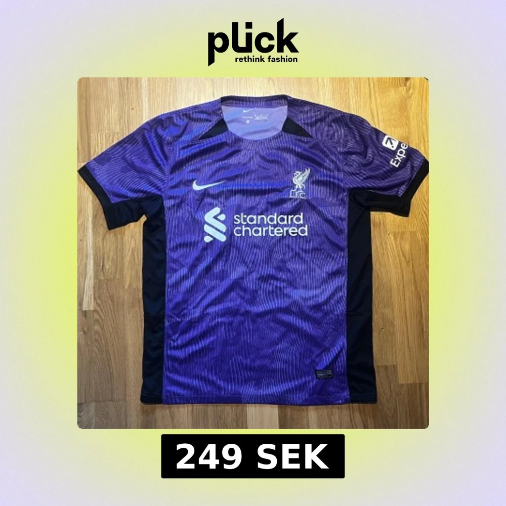 Säljer en liverpol tröja från Nike med korta ärmar. Tröjan har ett subtilt randigt mönster och klubbens logga på bröstet. Perfekt för fotbollsfans som vill visa sitt stöd.