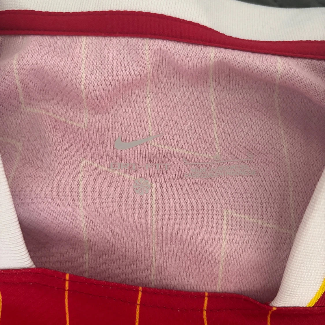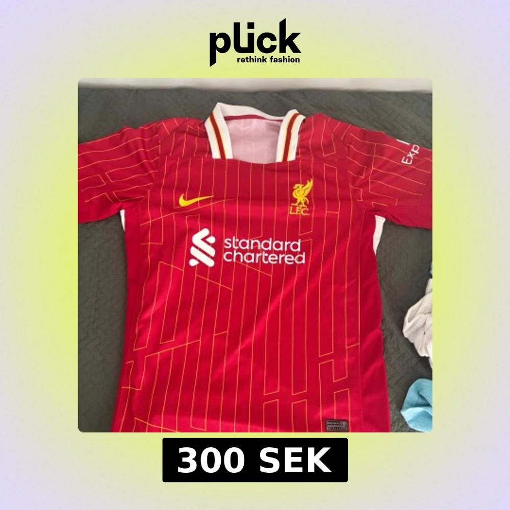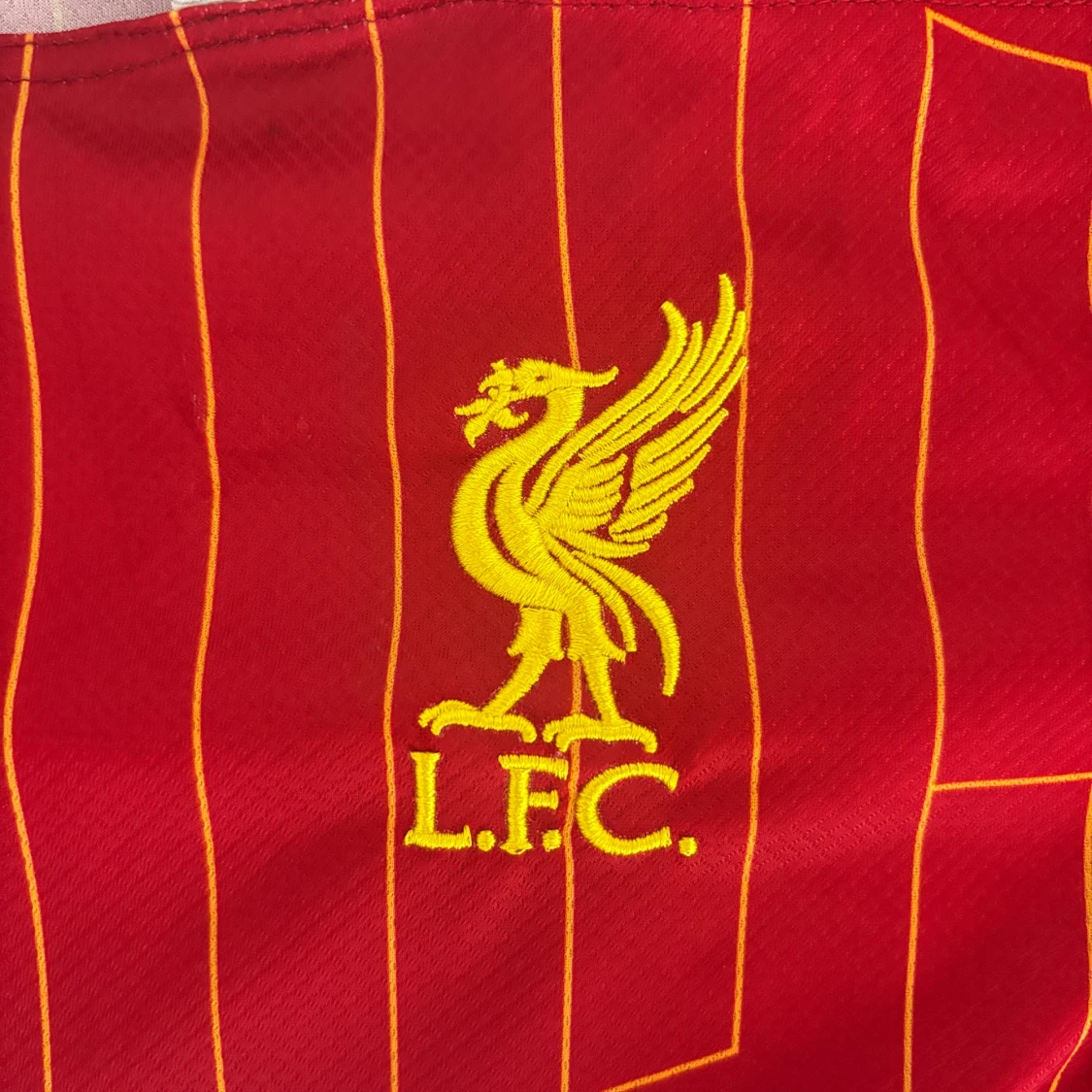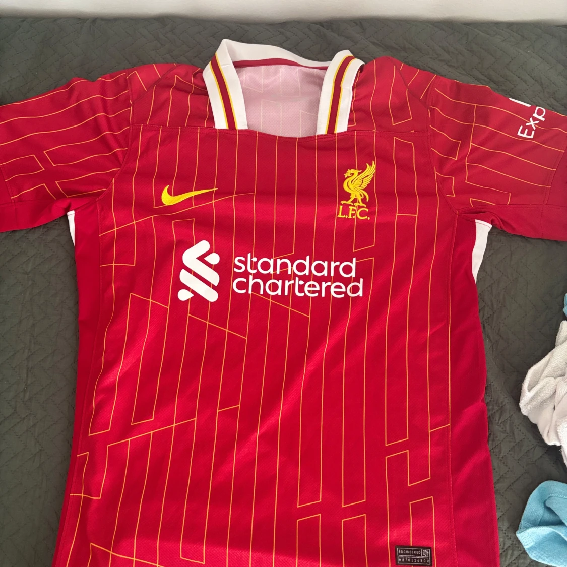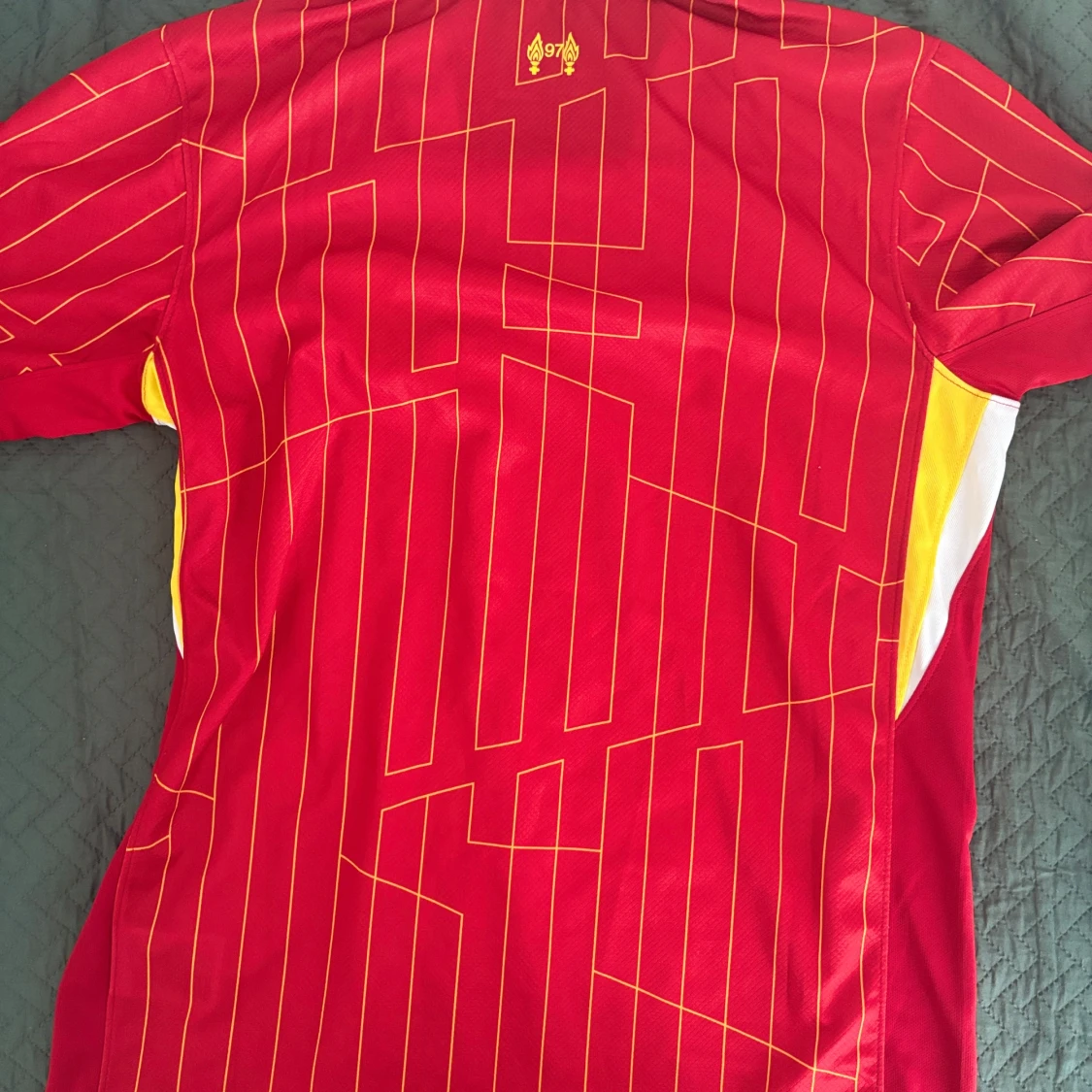 Liverpool FCs officiella matchtröja från Nike i rött med gula detaljer och tunna gula linjer. Tröjan har klubbmärket broderat på bröstet, vit och gul krage samt sponsortryck framtill. Tillverkad i lätt och ventilerande polyester, perfekt för fotboll eller supporterliv.