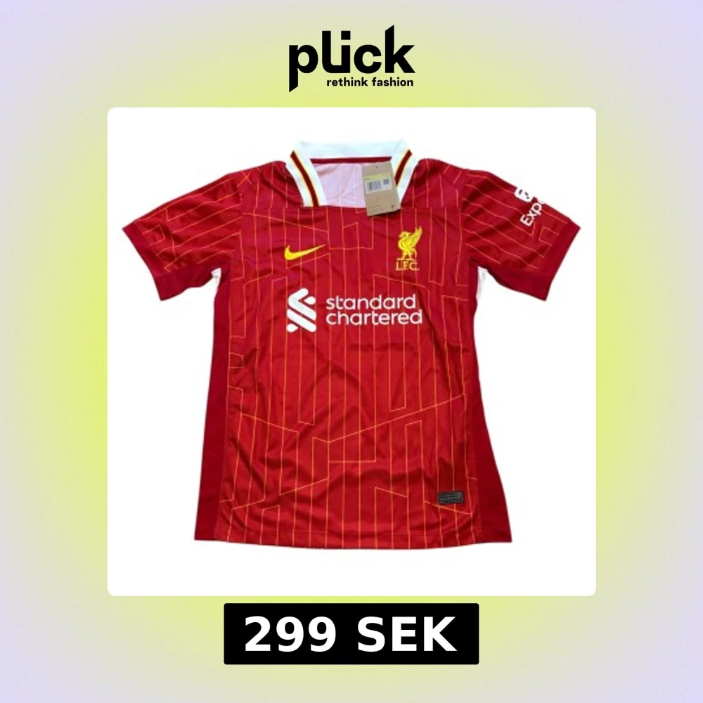 Liverpool FCs officiella matchtröja i rött från Nike med gula detaljer och tunna gula linjer i ett geometriskt mönster. Tröjan har korta ärmar, vit krage med röda och gula ränder samt broderat klubbmärke på bröstet. Tillverkad i lätt och ventilerande polyester.