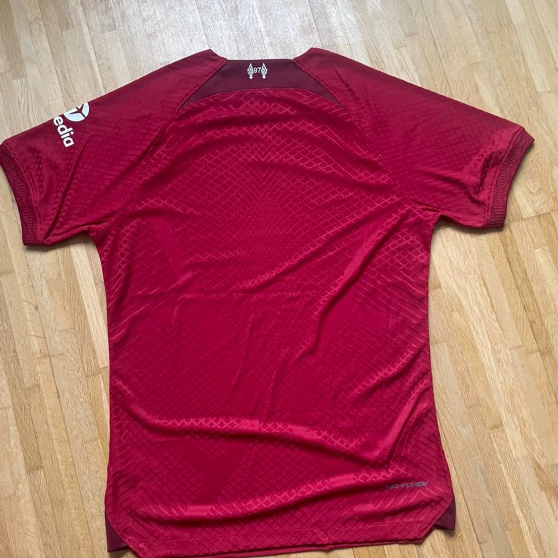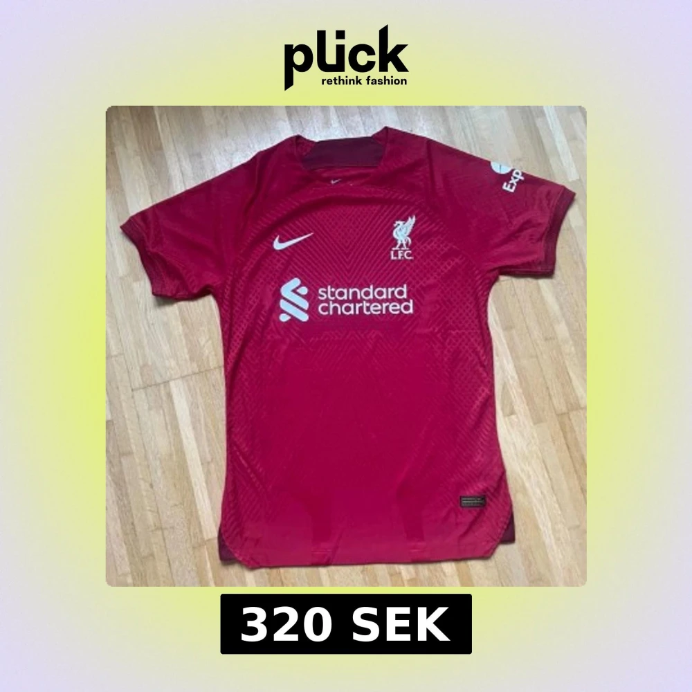 Liverpool FCs officiella matchtröja från Nike i en djup röd färg med subtilt geometriskt mönster. Tröjan har korta ärmar, rund hals och tryckta loggor från Standard Chartered och Expedia. Materialet är lätt och andas, perfekt för fotboll eller häng med polarna.