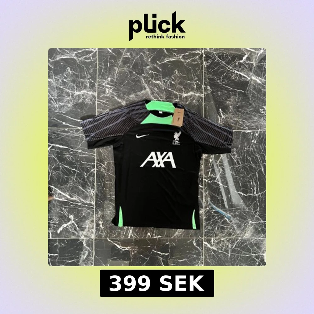 Liverpool FC tränings-tshirt från Nike i svart med gråmönstrade ärmar och gröna detaljer vid hals och sidor. Stor vit AXA-logga på bröstet och klubbmärke. Tillverkad i lätt och ventilerande funktionsmaterial, perfekt för fotbollsträning.