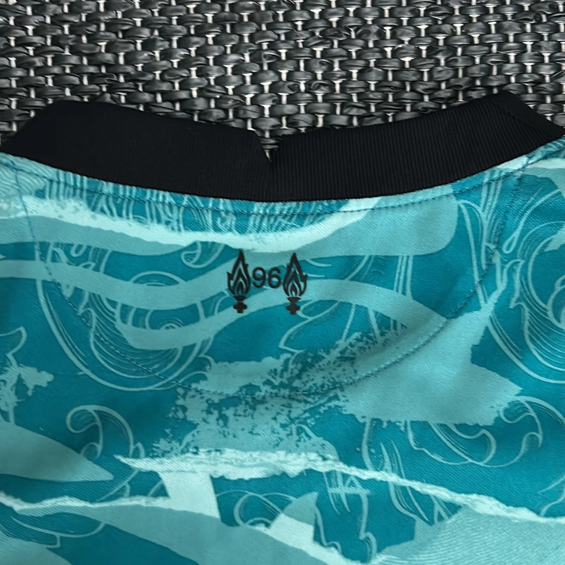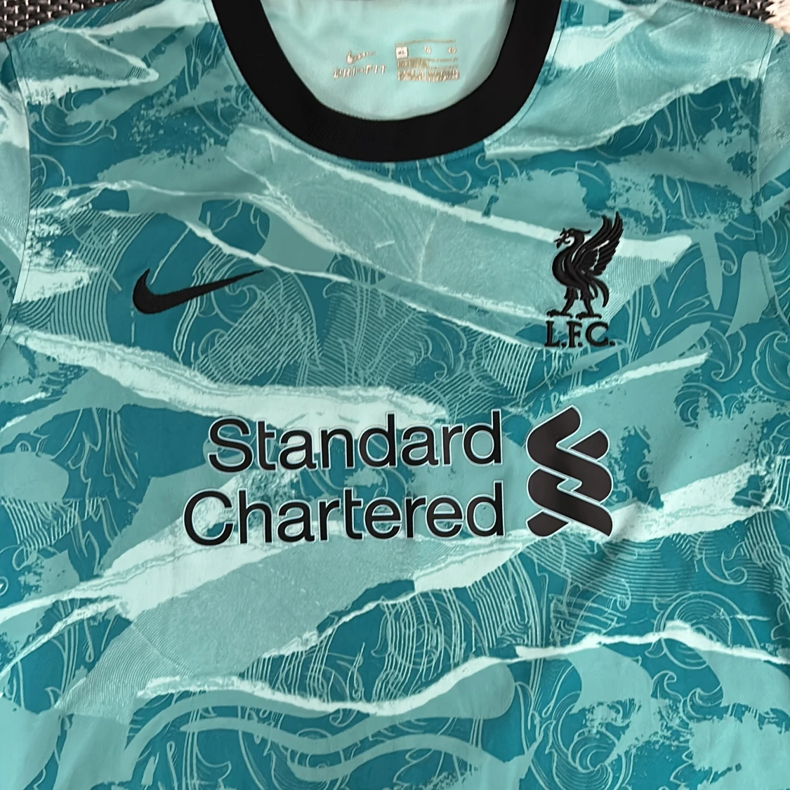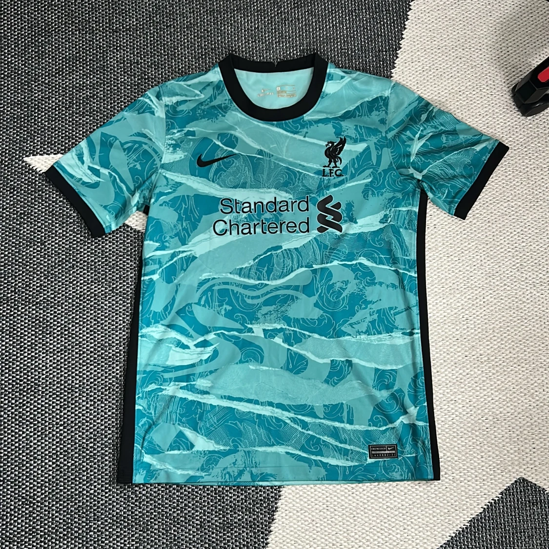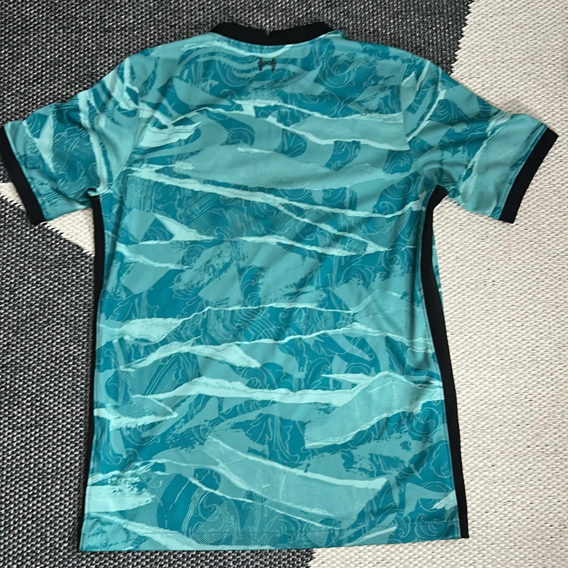 Snygg Liverpool FC fotbollströja från Nike i en ljusblå färg med mörkblå detaljer. Tröjan har ett unikt abstrakt mönster, svart Nike-logga och LFC-emblem på bröstet. Rund hals med svart kant och svarta muddar på ärmarna. Tillverkad i lätt och ventilerande polyester. Storlek XL barn men passar S vuxen