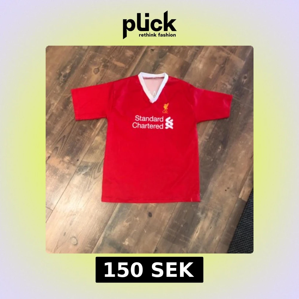 Röd Liverpool fotbollströja med vitt V-ringad krage, tryckt klubbmärke och sponsor på bröstet. På ryggen står M. Salah och nummer 11 i vitt. Perfekt för dig som vill visa ditt stöd för laget och Salah. Materialet är lätt och andas, typiskt för matchtröjor.