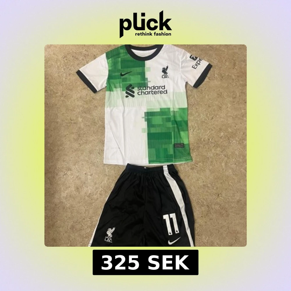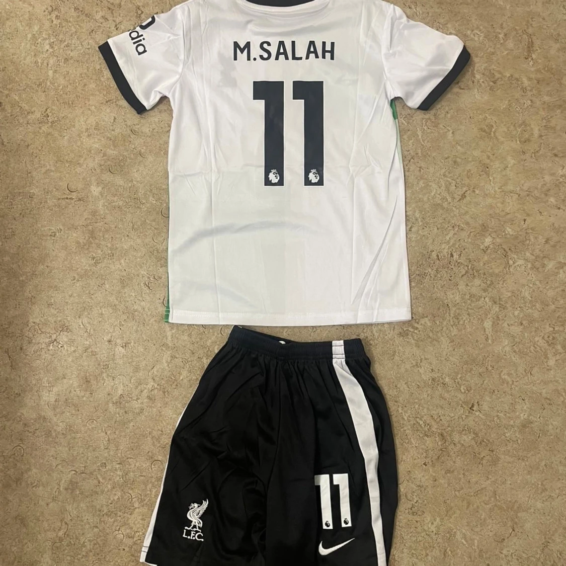 Liverpool FC fotbollströja med M. Salah och nummer 11 på ryggen. Tröjan är vit med gröna grafiska detaljer, svarta muddar och klubbmärke på bröstet. Kortärmad modell i lätt, ventilerande material. Nike-logga och sponsortryck på framsidan.