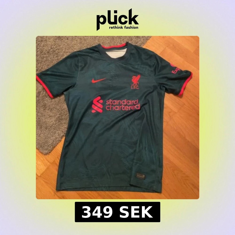 Säljer en grön Liverpool fotbollströja från Nike med korta ärmar och röda detaljer. Tröjan har LFC-loggan och sponsortryck på framsidan samt spelarnamnet Luis Díaz och nummer 23 på baksidan. Tillverkad i Dri-FIT-material för optimal komfort. Köpt på liverpool egna hemsida för runt 2 år sen. BVSA
