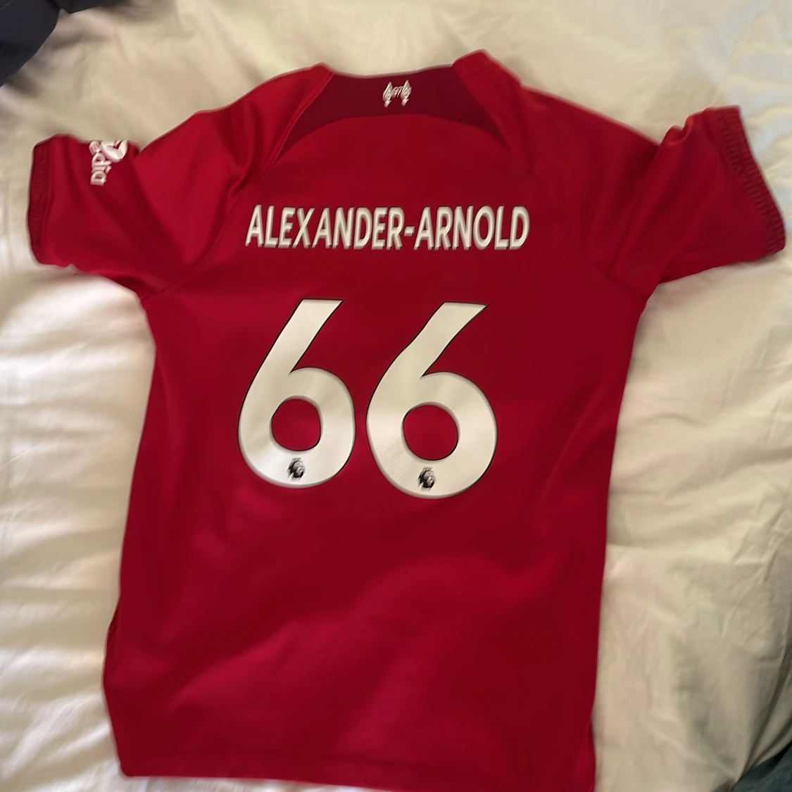 Liverpool FC matchtröja från Nike med Alexander-Arnold och nummer 66 på ryggen. Röd med vita tryck, kortärmad och tillverkad i Dri-FIT-material som andas. Klassisk passform med klubbmärke och sponsorlogga framtill.