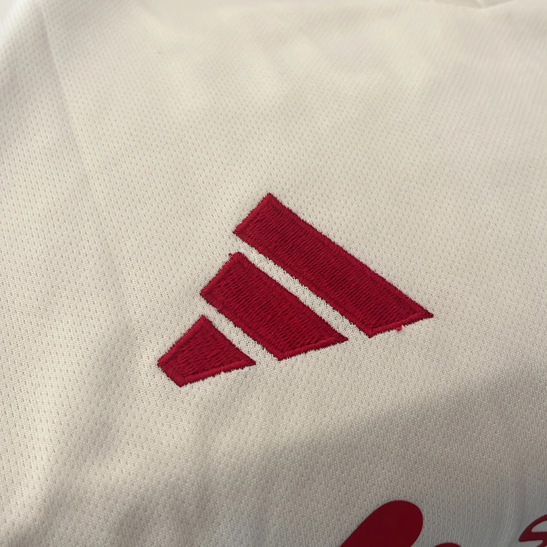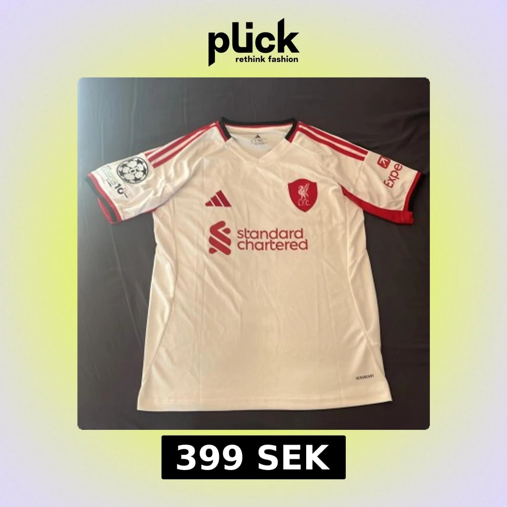 Liverpool FC bortatröja med Van Dijk 4 på ryggen. Vit med röda detaljer, broderat klubbmärke och Adidas-logga. Kortärmad modell i ventilerande Aeroready-material, Champions League-märke på ärmen och klassiska röda ränder på axlarna. Player version