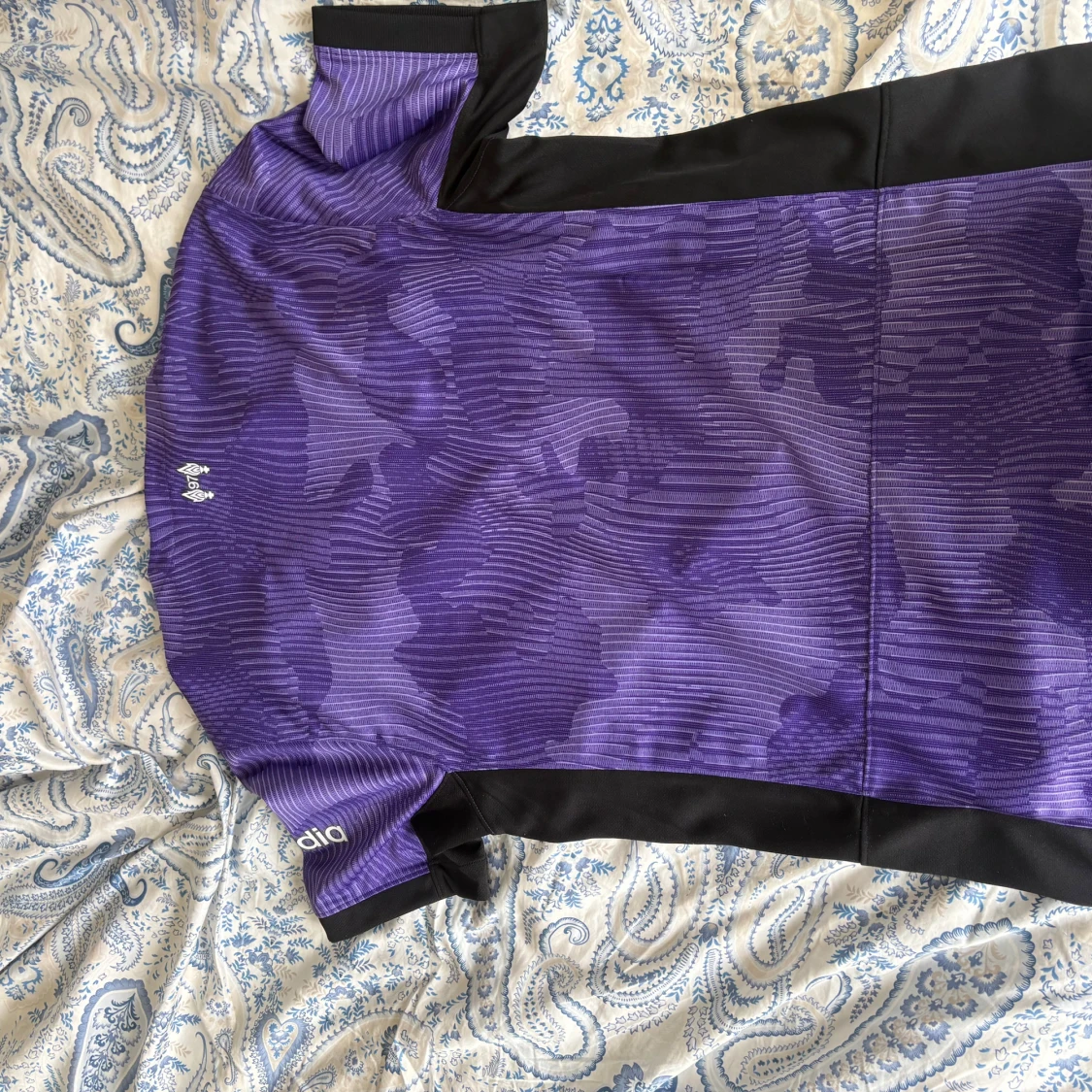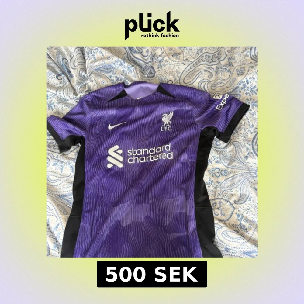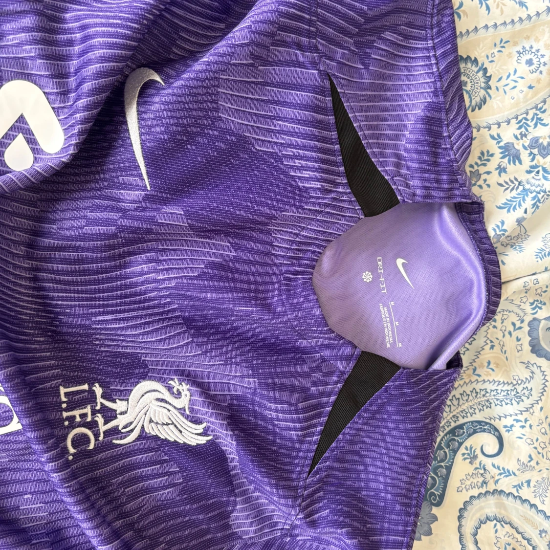 Liverpool FC matchtröja från Nike i lila med svarta detaljer och vitt klubbmärke. Tröjan har korta ärmar, modern passform och är tillverkad i lätt, ventilerande Dri-FIT-material. Snyggt mönster över hela tröjan och tryckta sponsorloggor på bröst och ärm. Äkta tröja