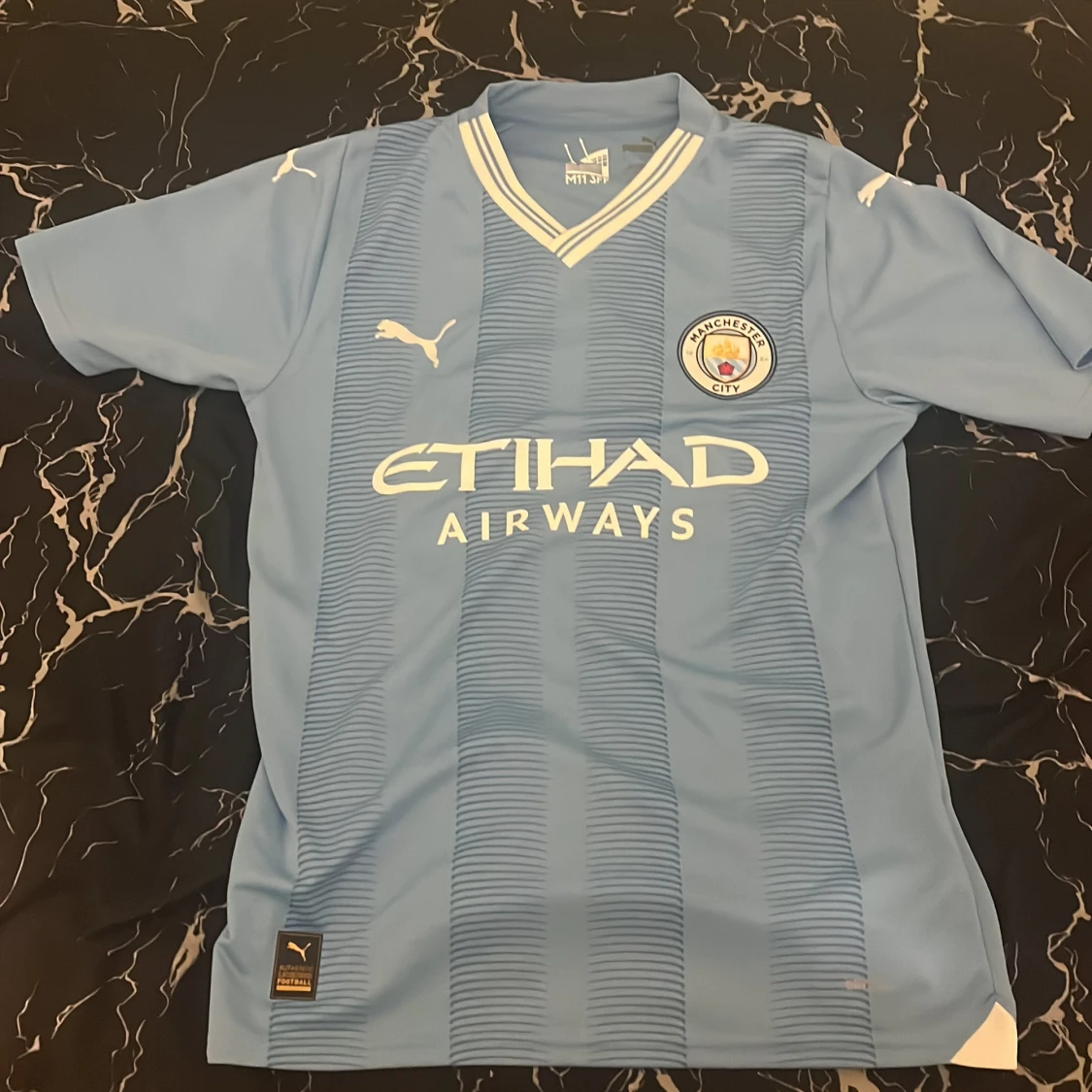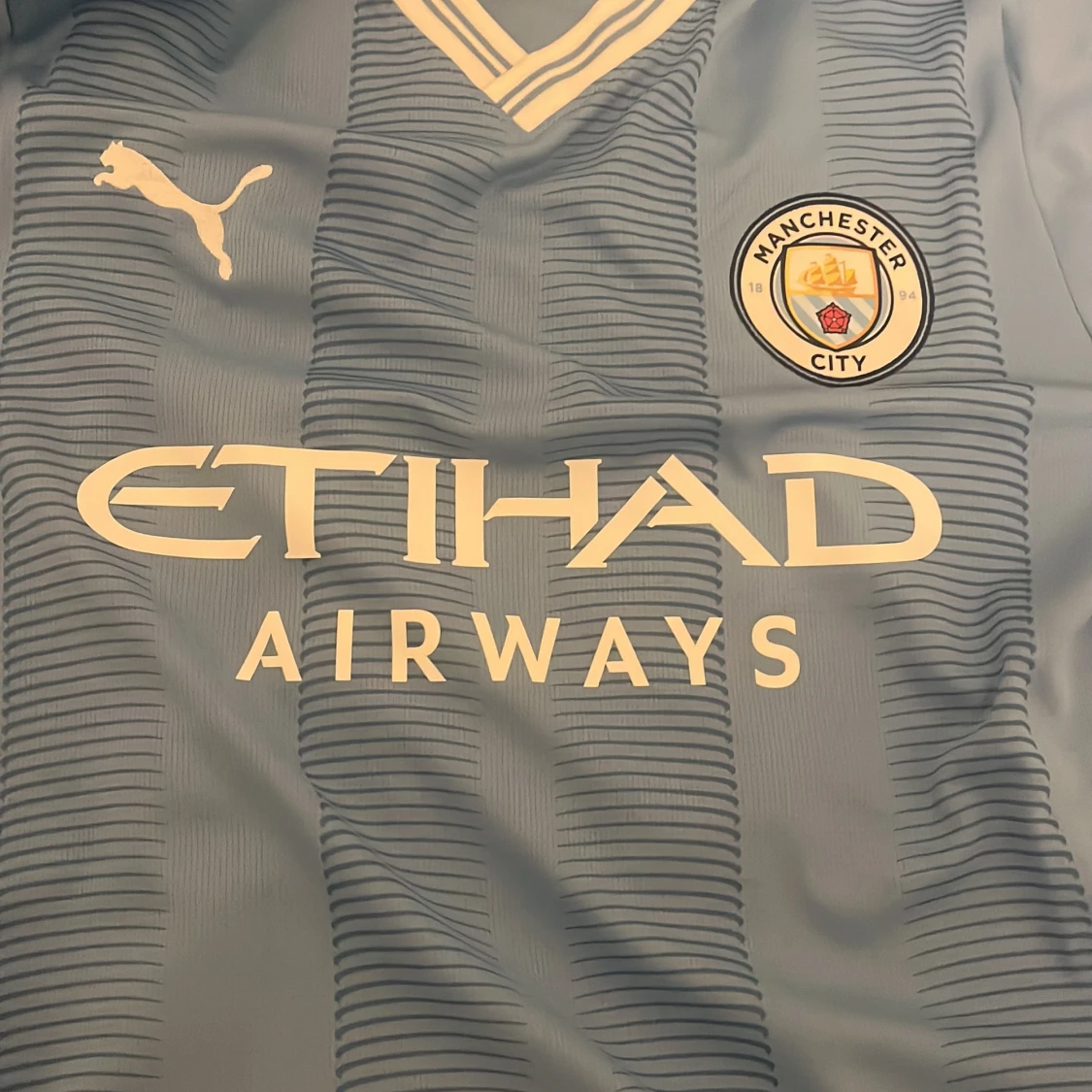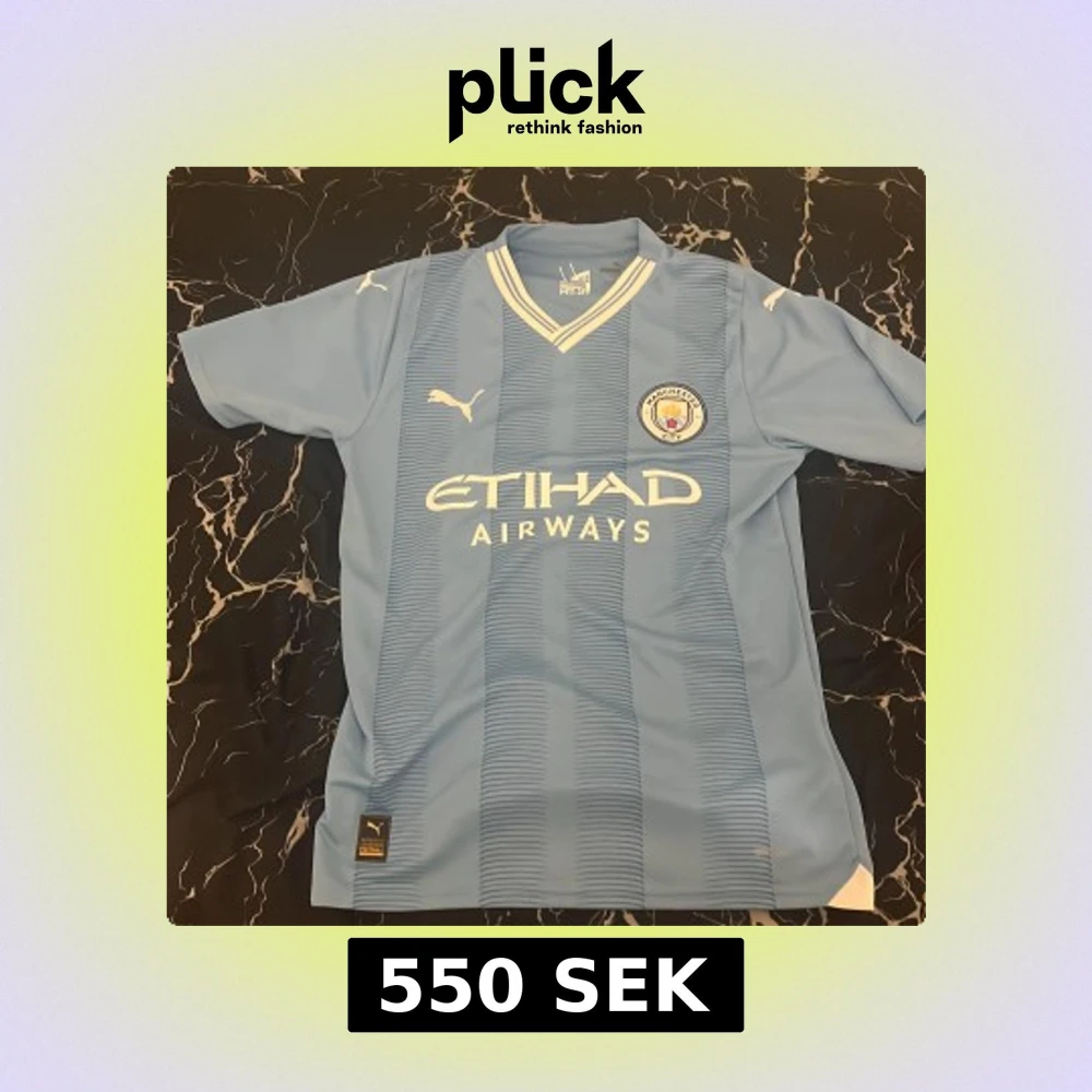 Säljer en ljusblå Manchester City fotbollströja från Puma med klubbens emblem och Etihad Airways som sponsor. Tröjan har korta ärmar och ett randigt mönster. Perfekt för alla City-fans! 💙 aldrig använt riktigt bra pris