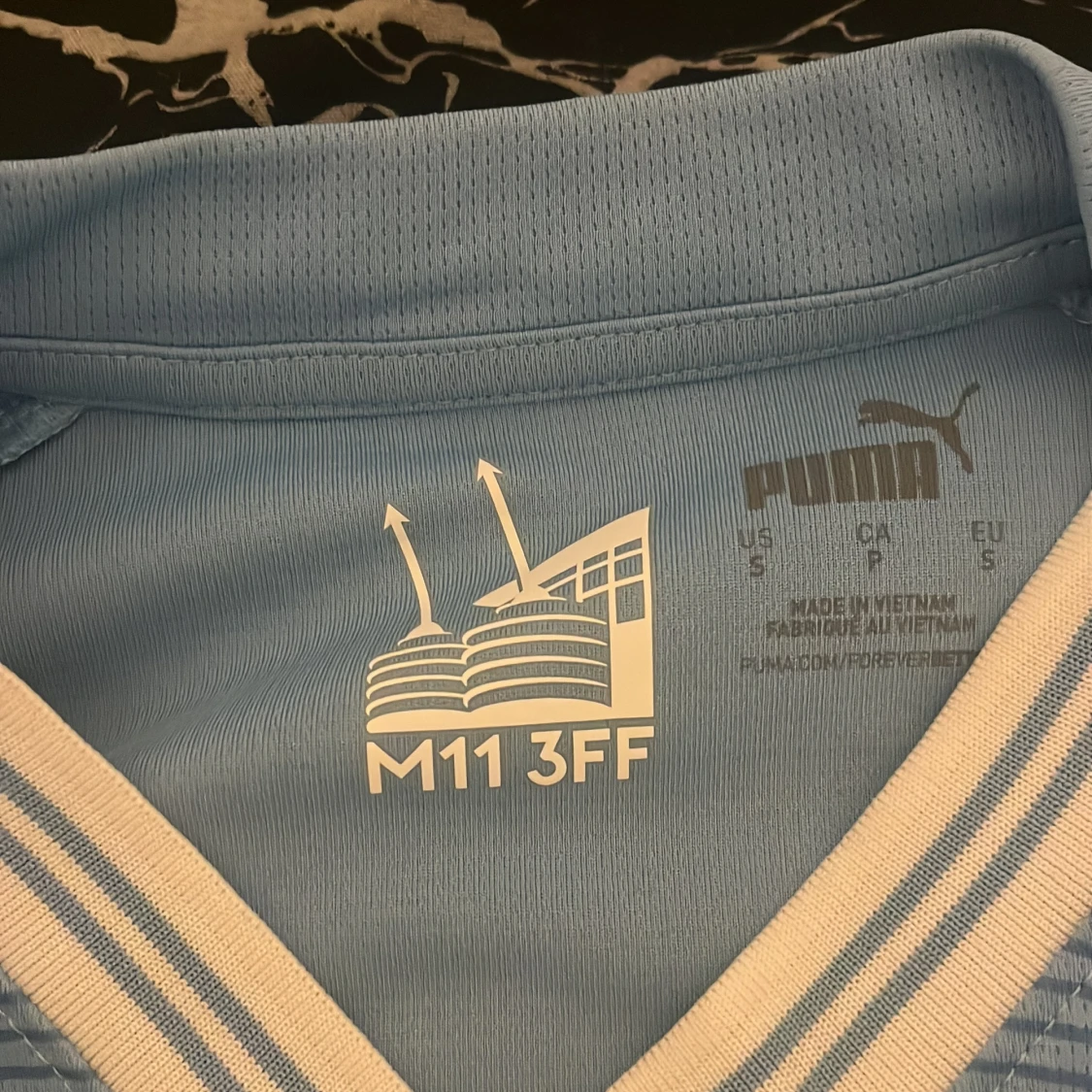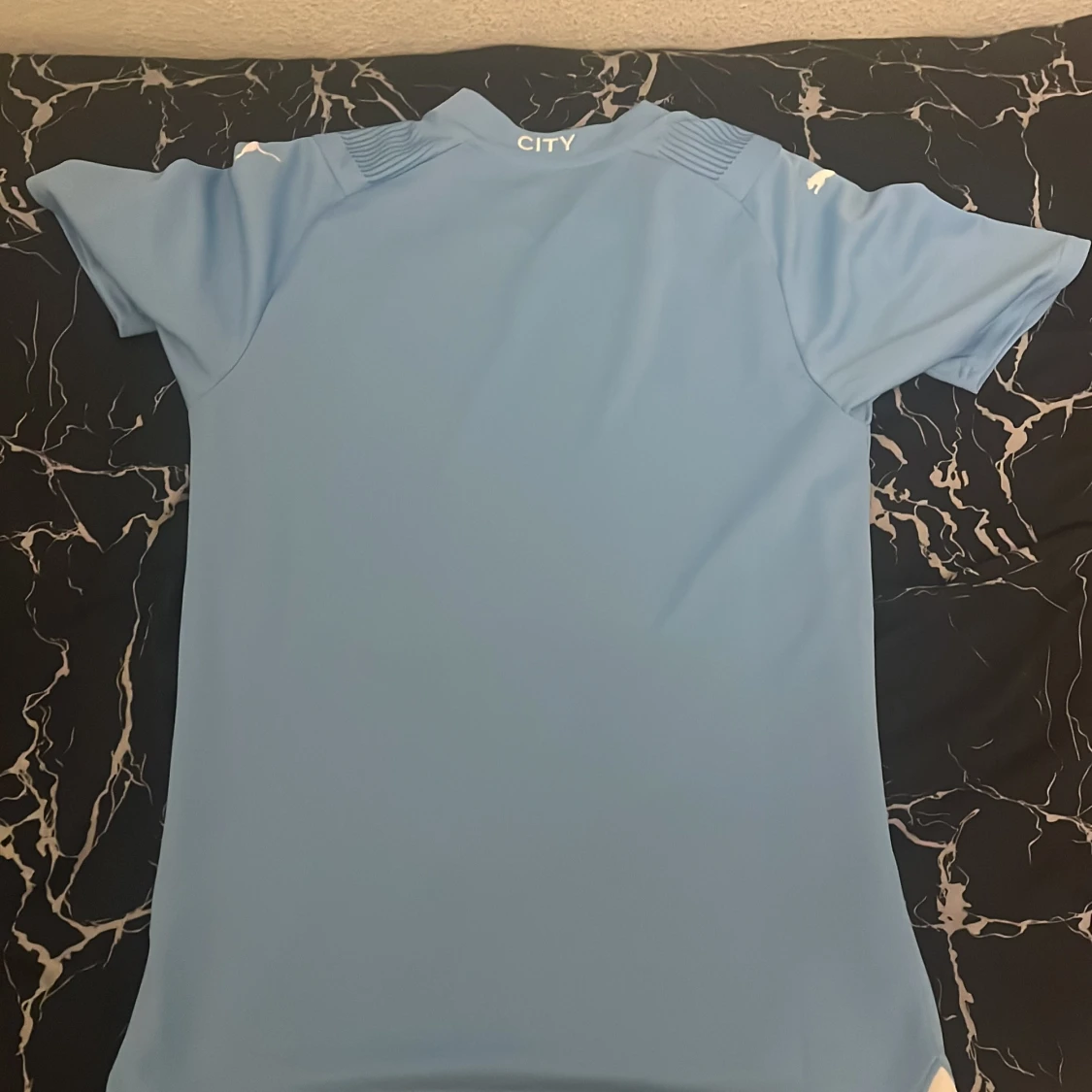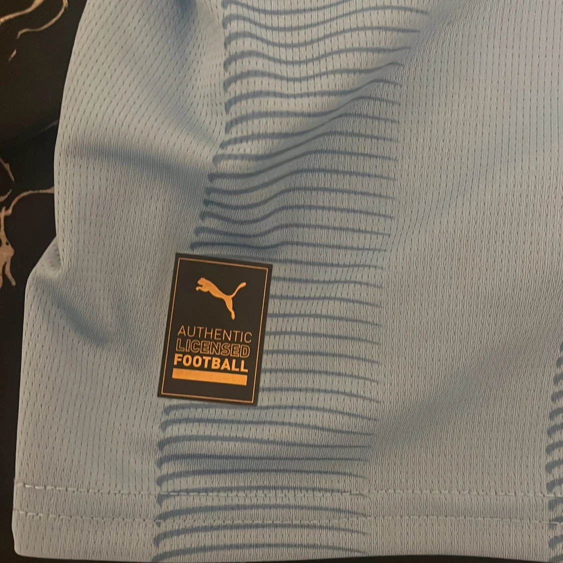 Säljer en ljusblå Manchester City fotbollströja från Puma med klubbens emblem och Etihad Airways som sponsor. Tröjan har korta ärmar och ett randigt mönster. Perfekt för alla City-fans! 💙 aldrig använt riktigt bra pris