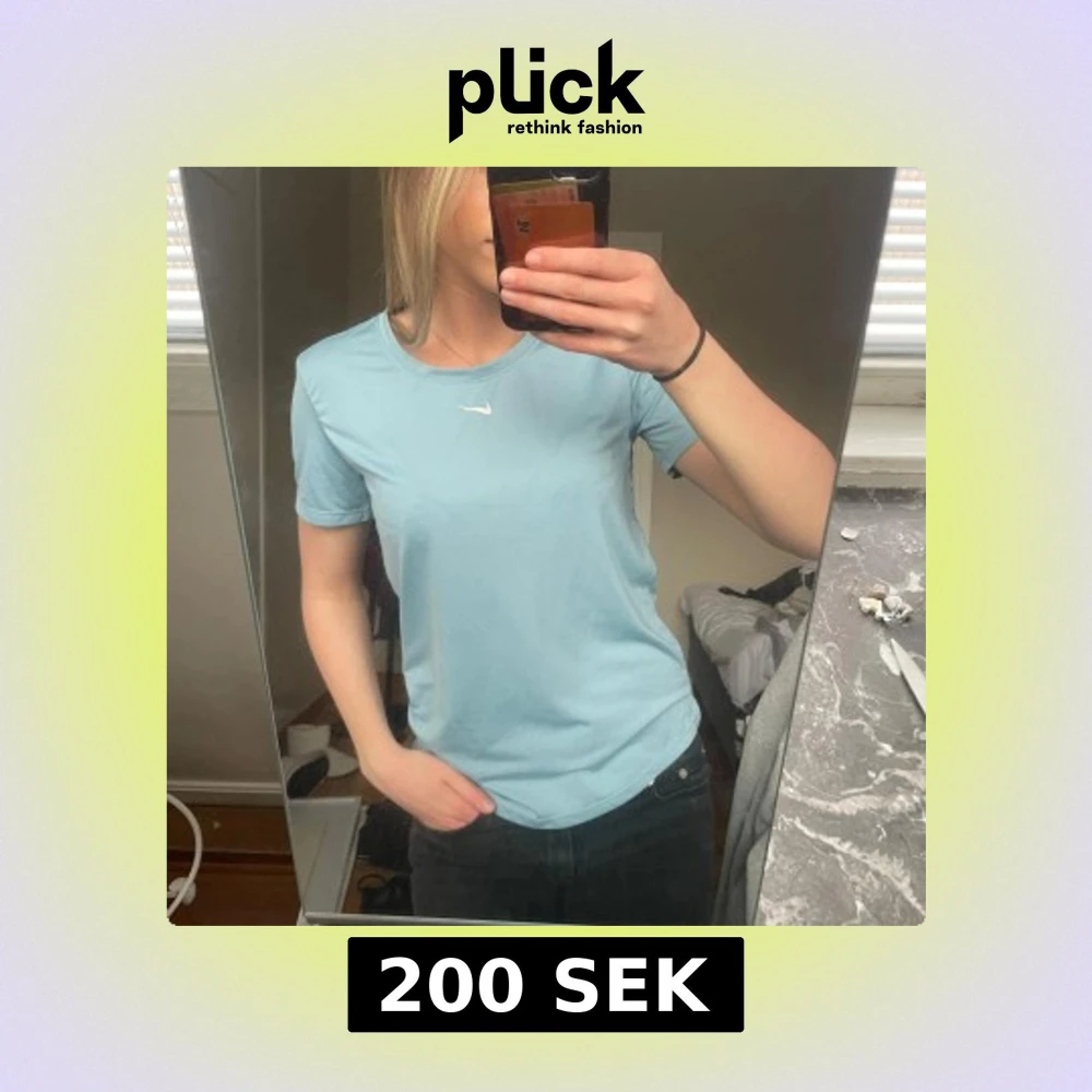 Säljer en ljusblå Nike Dri-FIT t-shirt med rund hals och ett Nike märke på bröstet. T-shirten är tillverkad i ett mjukt och funktionellt syntetmaterial som andas, perfekt för träning. Klassisk passform och korta ärmar.