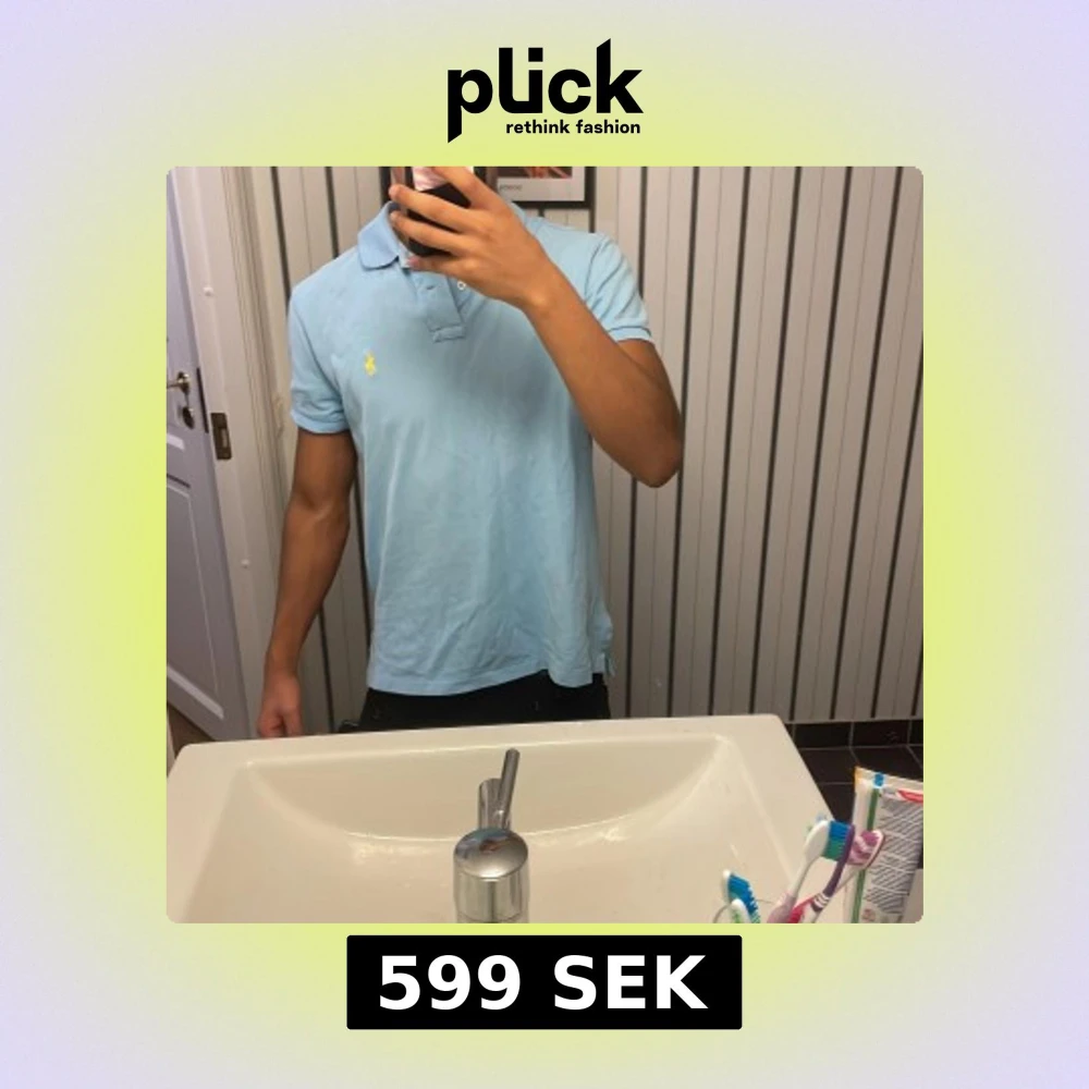Snygg ljusblå pikétröja från Ralph Lauren med klassisk krage och korta ärmar. Den har en broderad gul logotyp på bröstet.