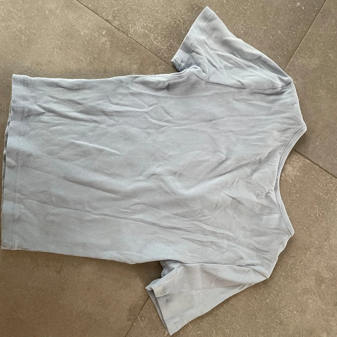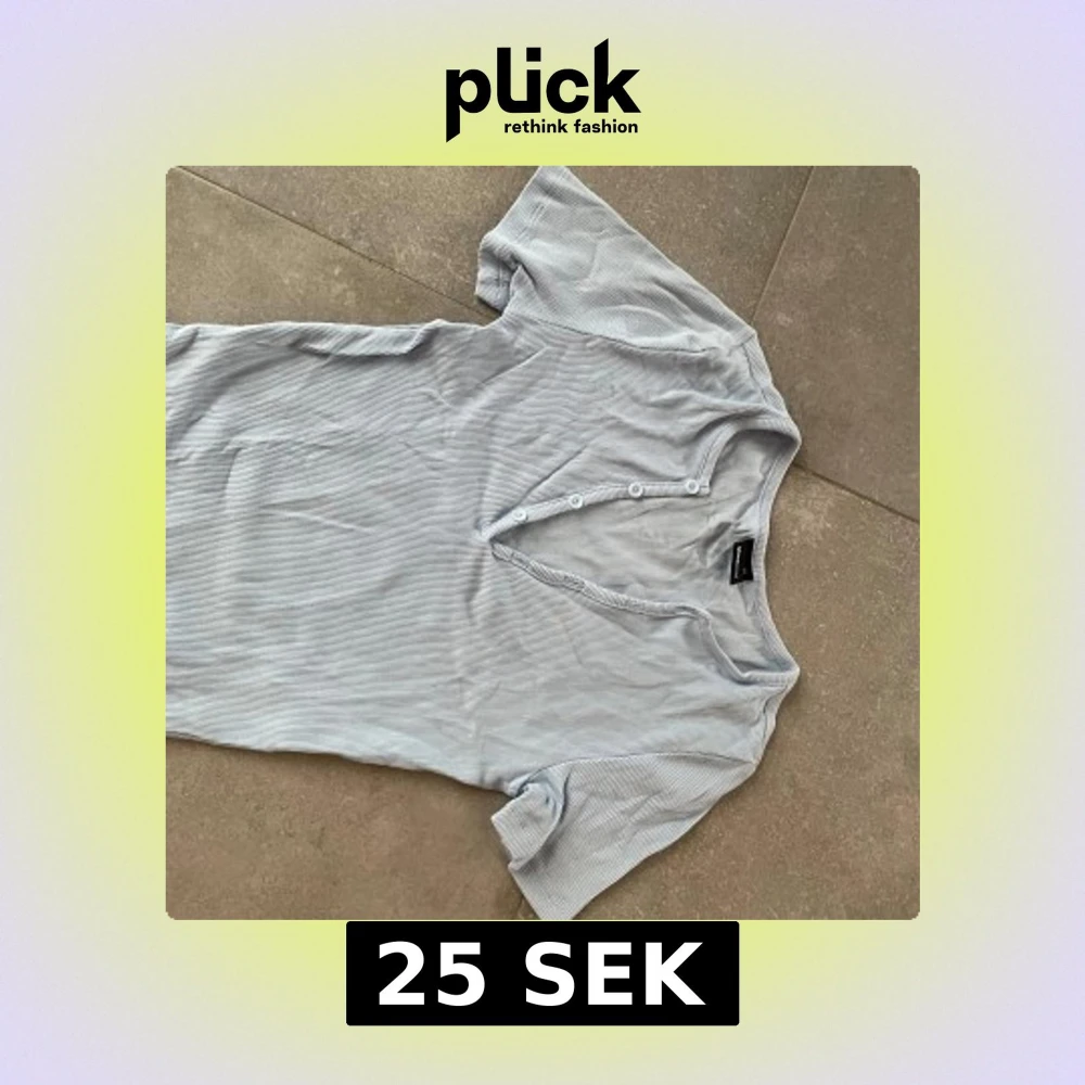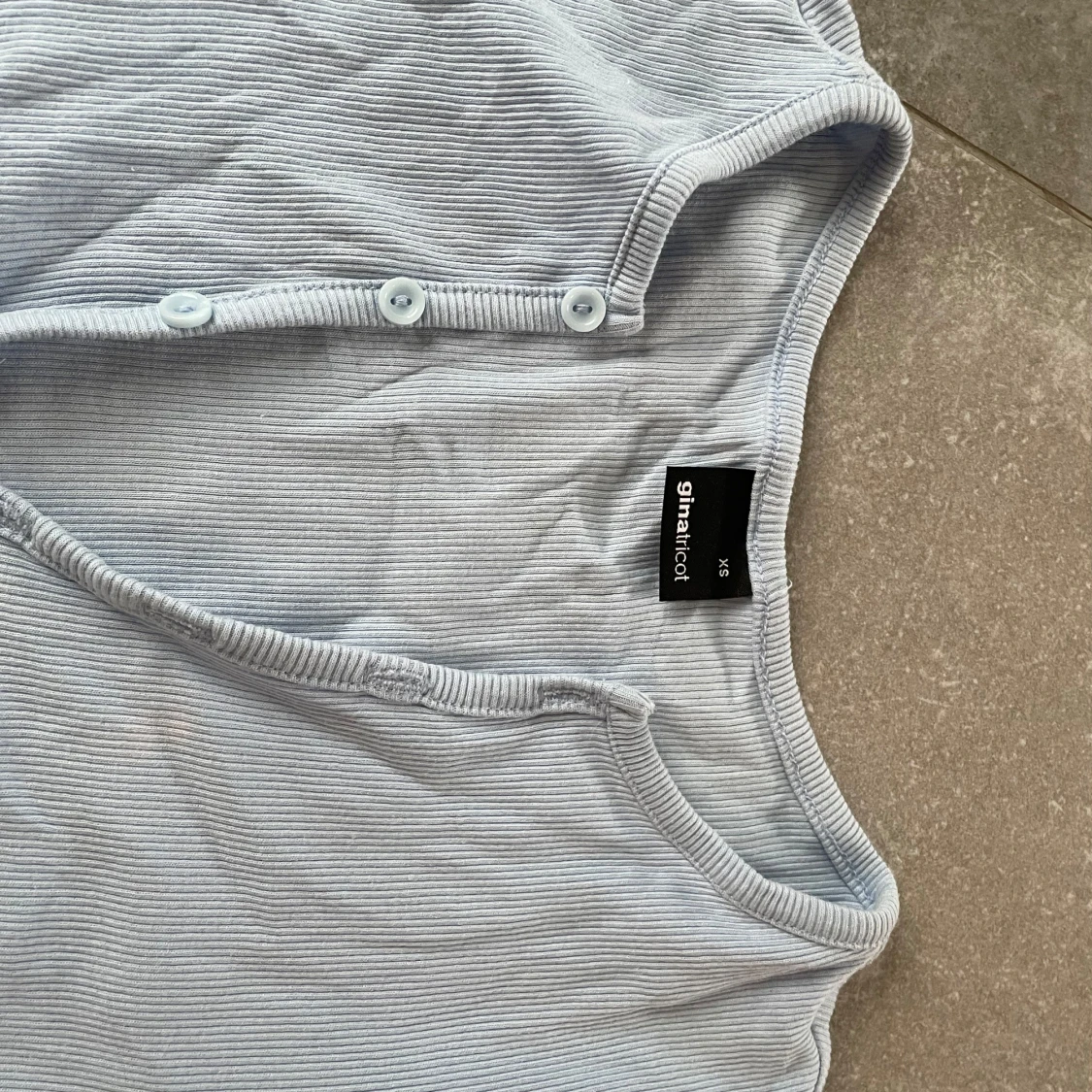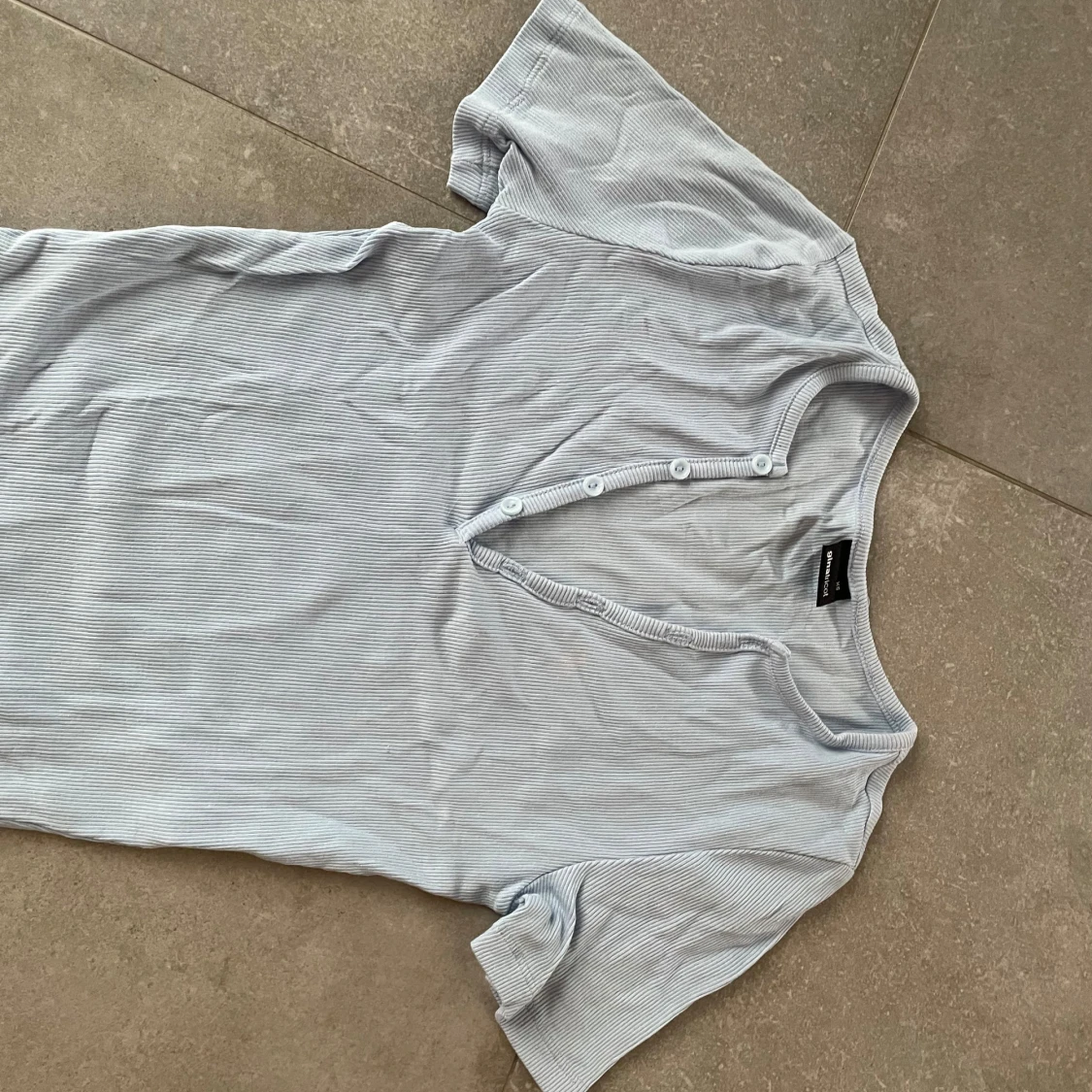 Säljer en ljusblå ribbad topp från Gina Tricot. Toppen har korta ärmar och knappar framtill som ger en snygg detalj. Perfekt för en avslappnad stil.