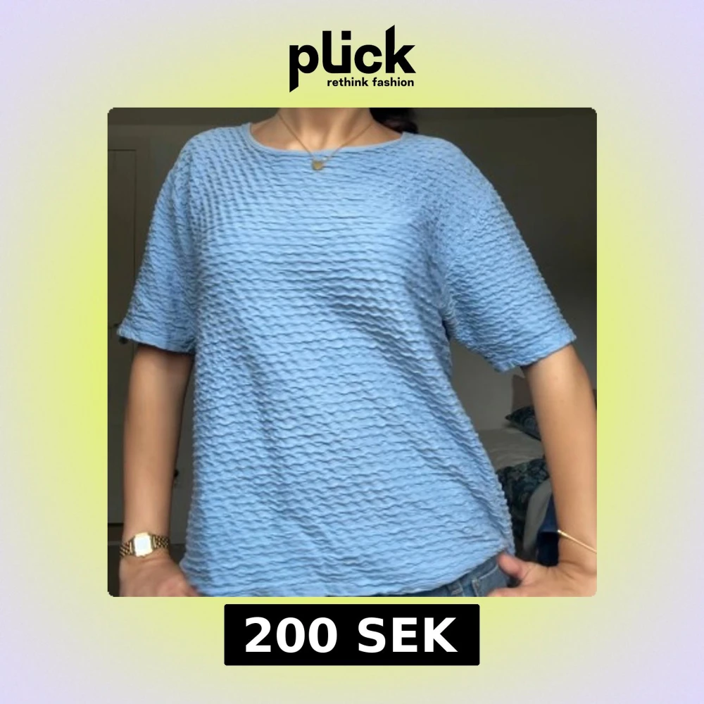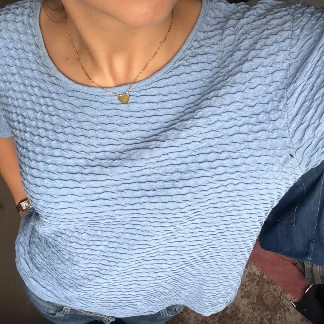 Säljer en ljusblå t-shirt med unik vågig struktur i tyget. T-shirten har rund halsringning och korta ärmar.