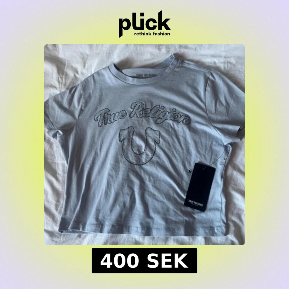 Säljer en ljusblå magtröja, t-shirt från True Religion med glittrande stenar som formar loggan och texten på bröstet. T-shirten är croppad och har en klassisk rund halsringning samt korta ärmar. Perfekt för en trendig och avslappnad look.