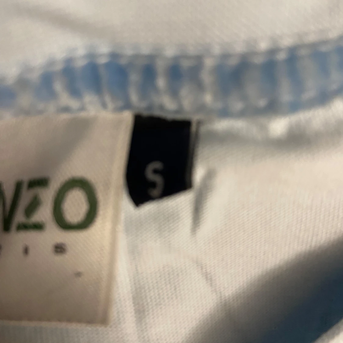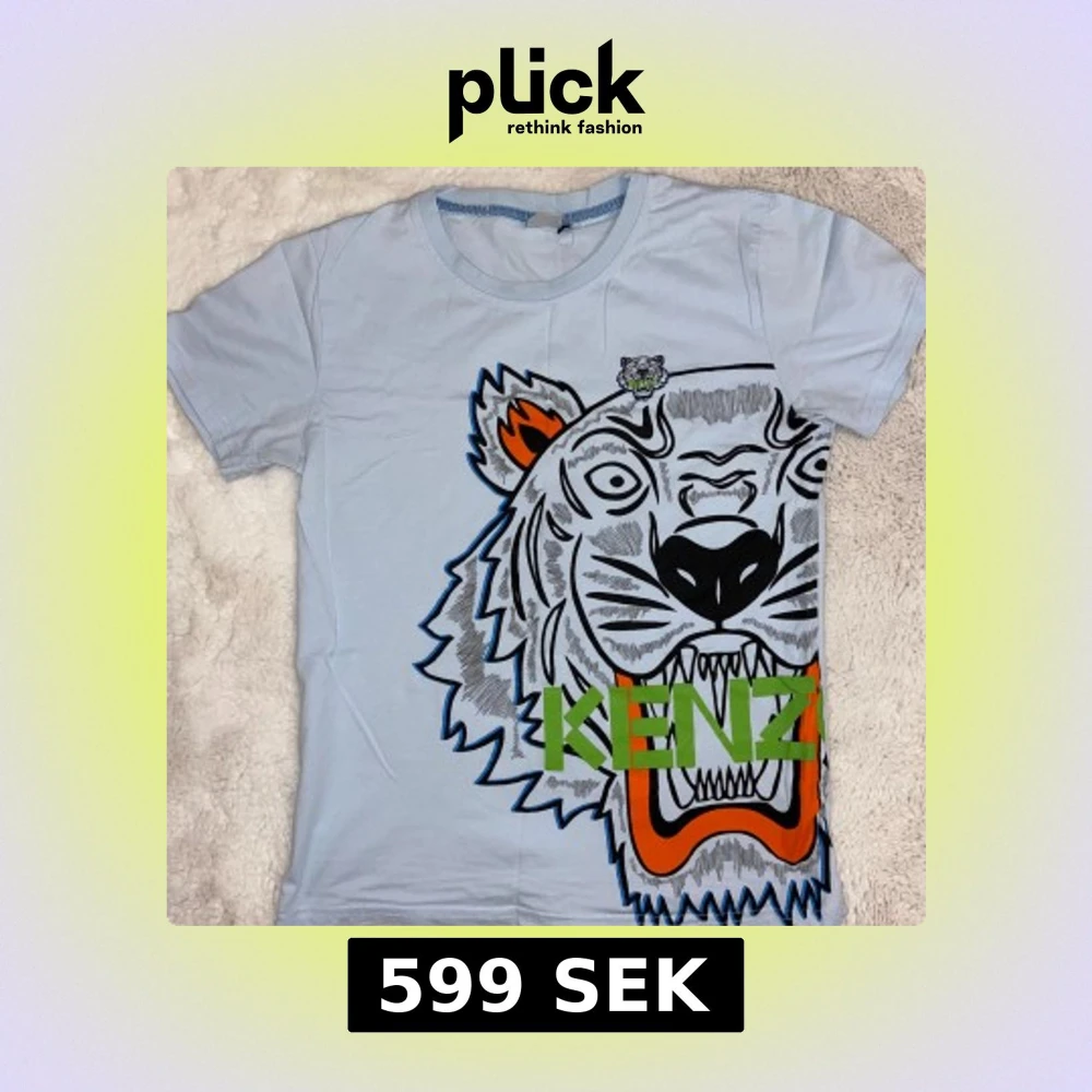 Säljer en cool ljusblå t-shirt från Kenzo med ett stort tigertryck i svart, orange och grönt. T-shirten har korta ärmar och en normal passform. Perfekt för att ge din outfit en färgstark touch! 🐯