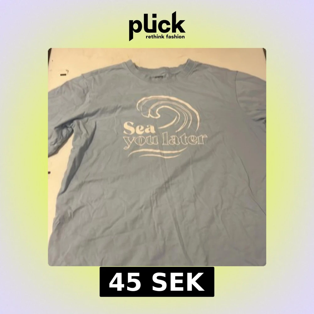 Ljusblå t-shirt med vit text och vågmotiv på bröstet där det står 'Sea you later'. Klassisk rund hals och korta ärmar. Skön och avslappnad passform, perfekt för chill dagar. Materialet känns mjukt och lätt. Dock har varan två fläckar som ni kan se på bilden.
