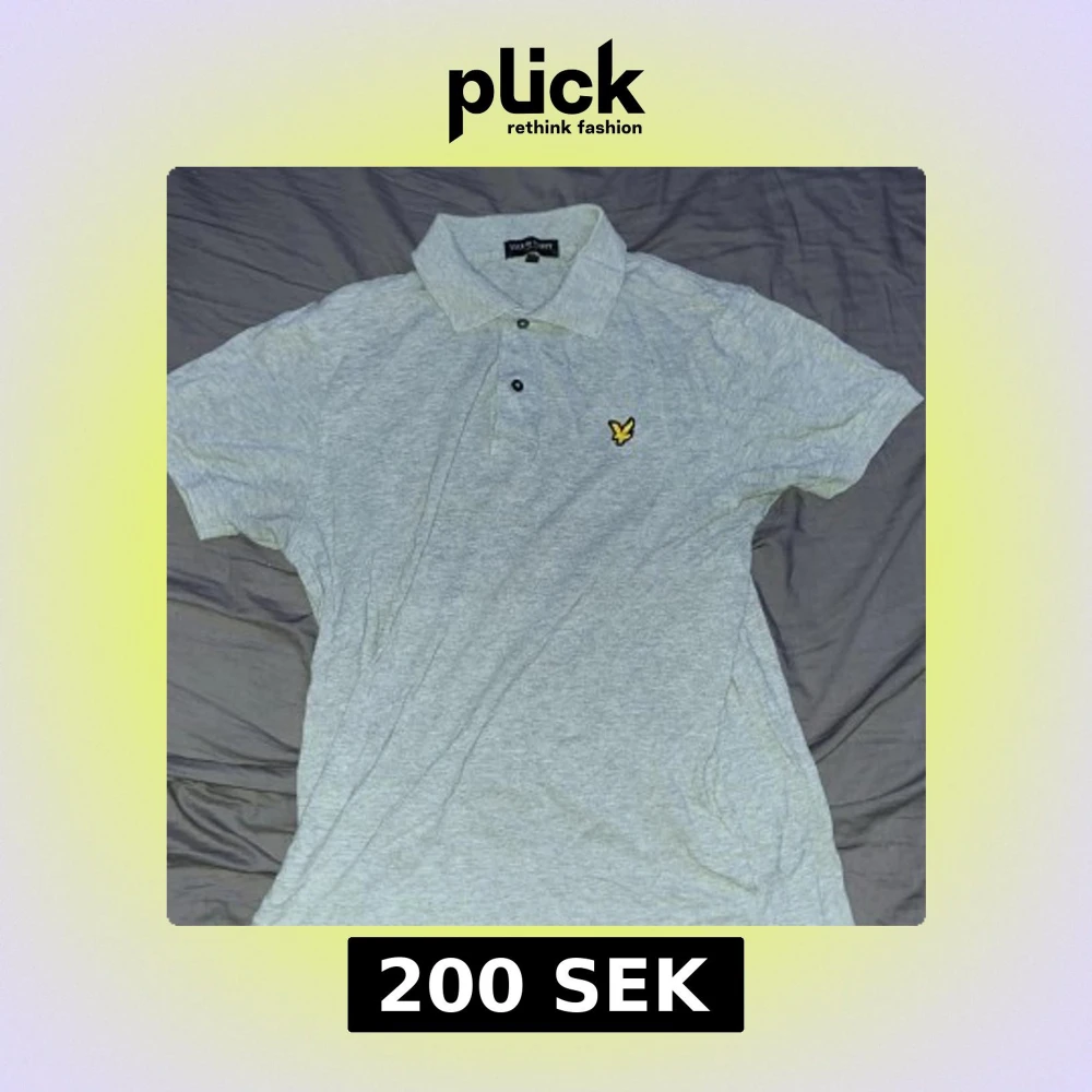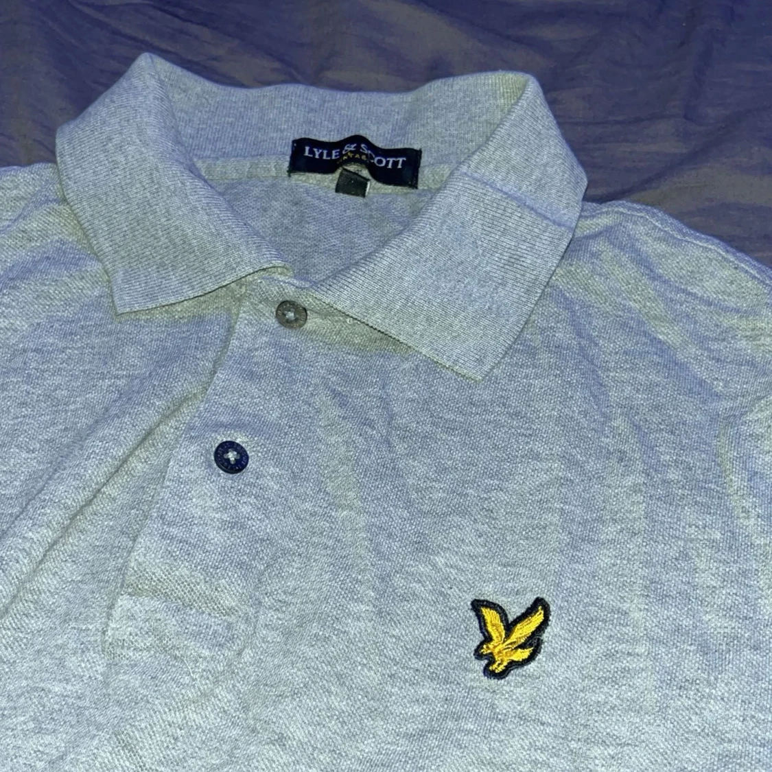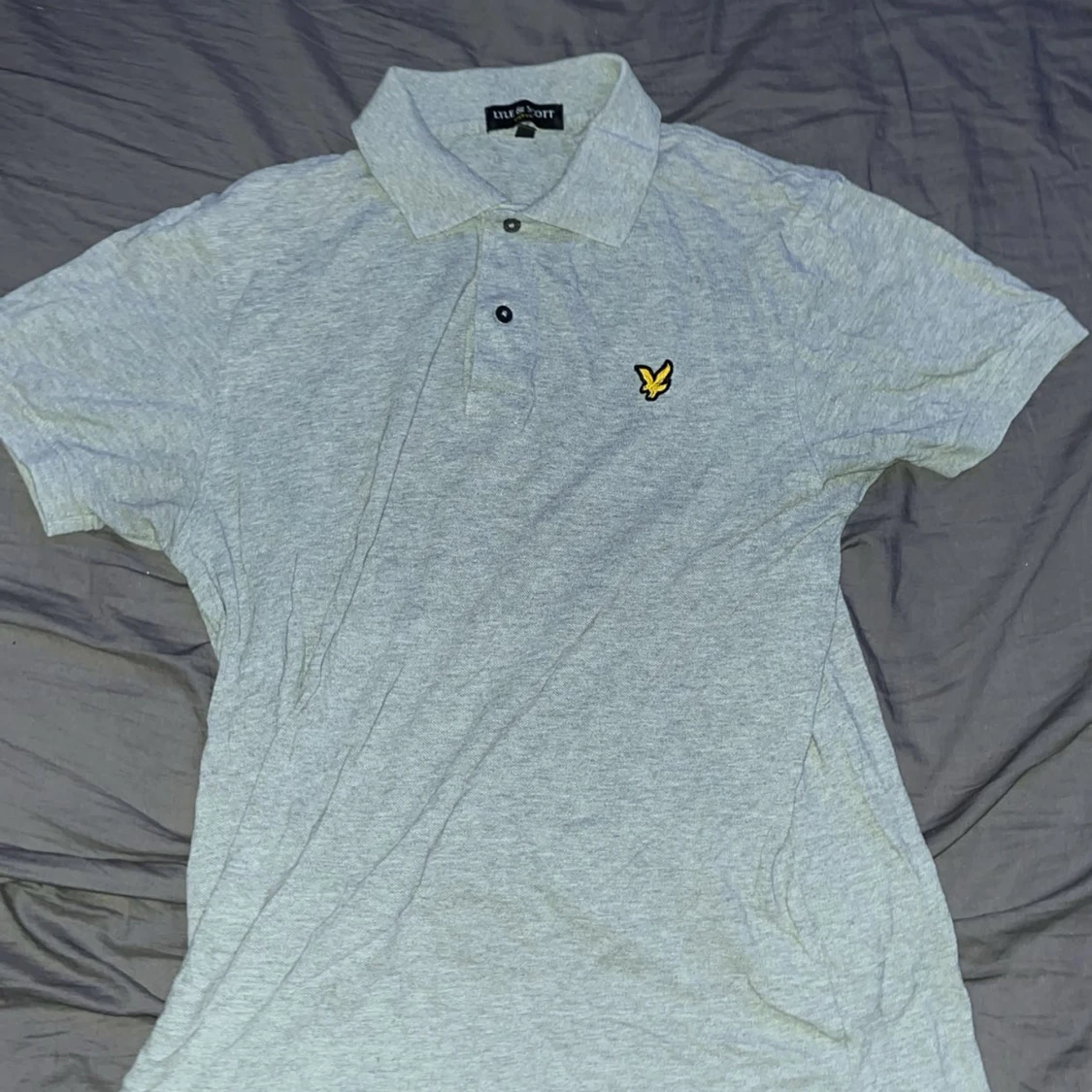 Säljer en ljusgrå pikétröja från Lyle & Scott med klassisk krage och två knappar framtill. Tröjan har korta ärmar och den ikoniska gula loggan broderad på bröstet. Perfekt för en stilren och avslappnad look.