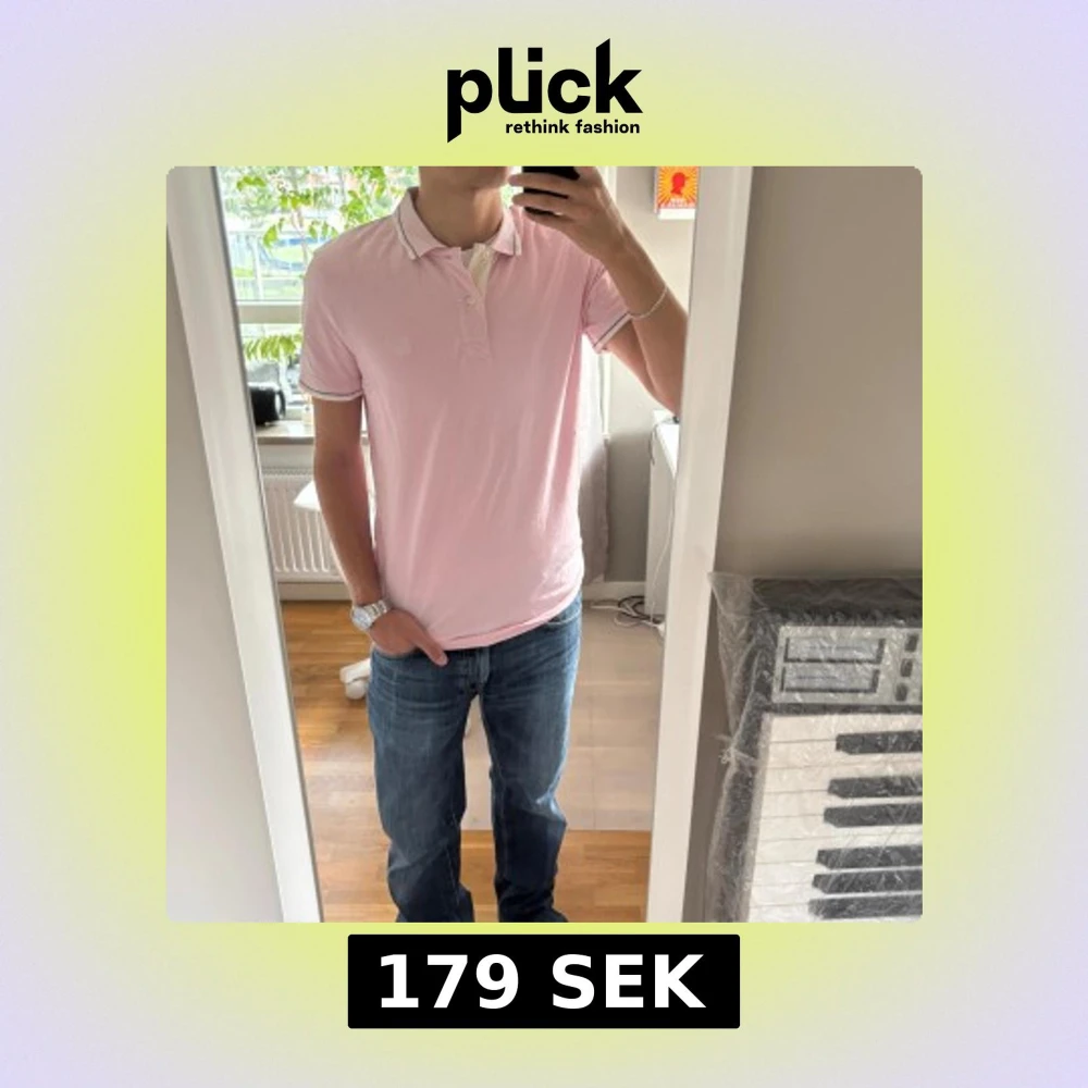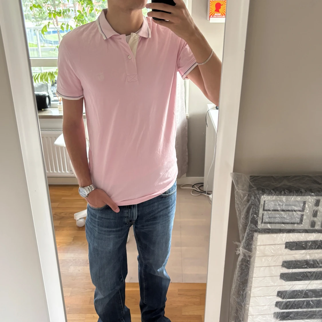 Säljer en ljusrosa pikétröja med vit krage och knappslå. Tröjan har korta ärmar med vit kant och en diskret broderad logga på bröstet. Perfekt för dig som gillar stilrena och softa färger. Materialet känns som bomull och är skönt mot huden.