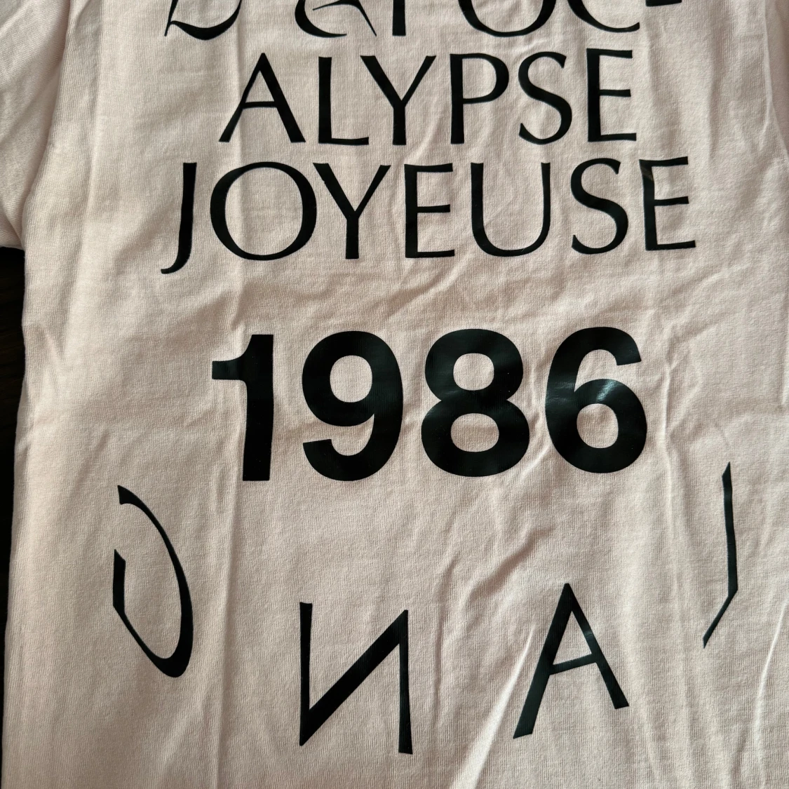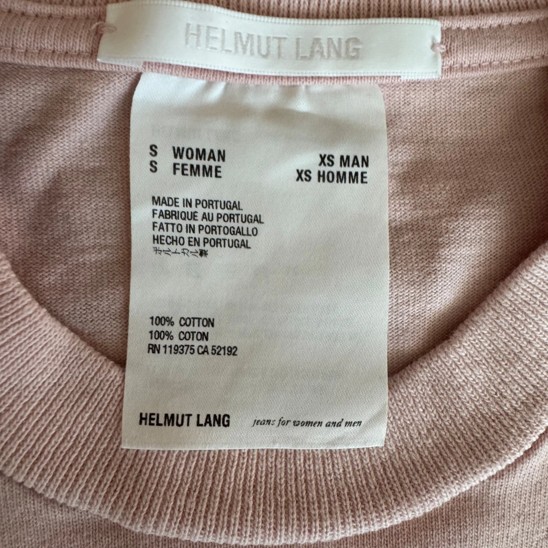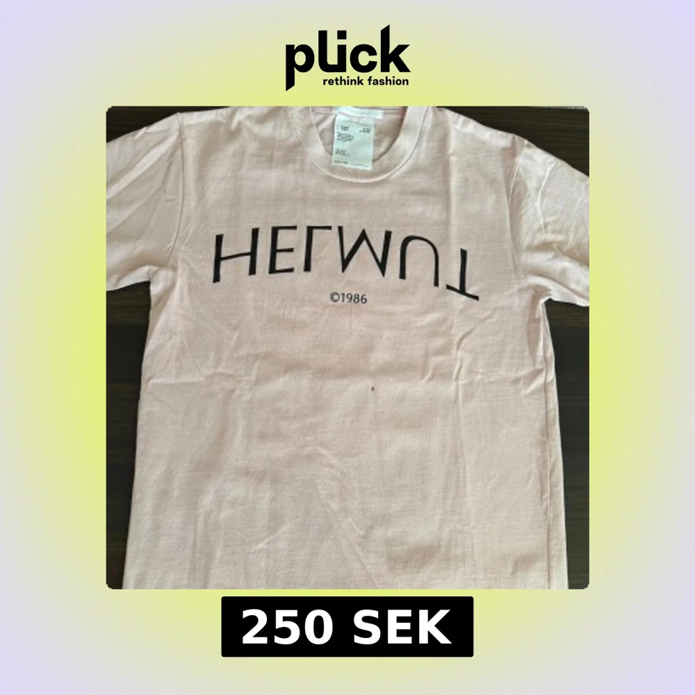 Säljer en stilren ljusrosa t-shirt från Helmut Lang med tryck på framsidan. Tillverkad i 100% bomull, vilket gör den mjuk och bekväm. Perfekt för en avslappnad look. Liten fläck på magen