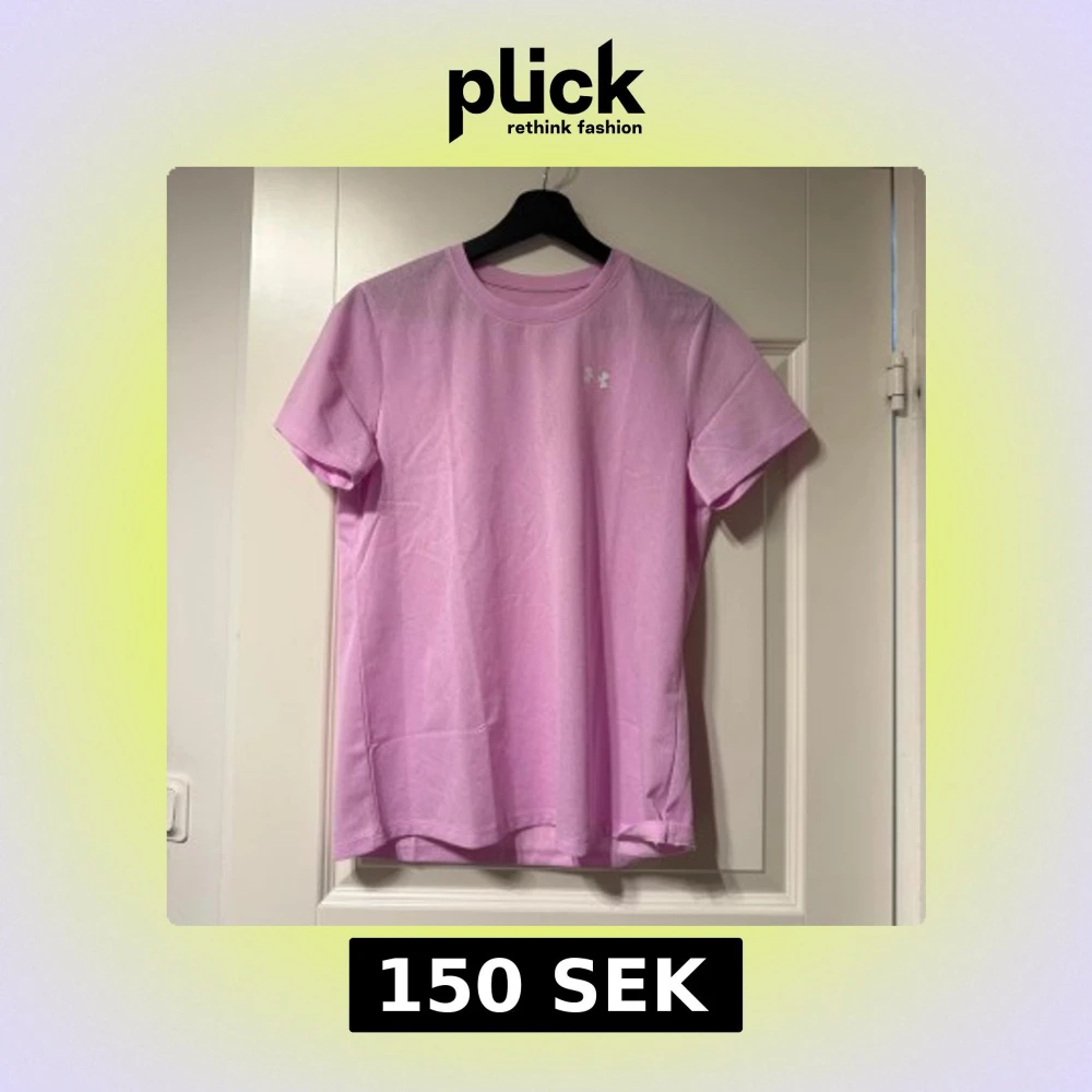 Säljer en ljusrosa t-shirt från Under Armour. Den har en enkel design med korta ärmar och en rund halsringning. Perfekt för träning eller vardagsbruk. Under Armour-loggan syns diskret på bröstet.