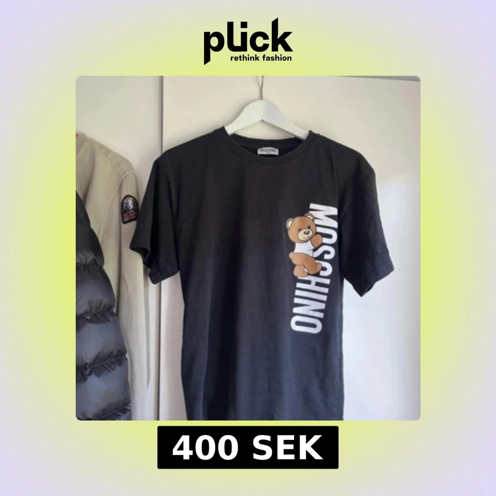 Cool svart t-shirt från Moschino med stort vertikalt Moschino-tryck och en björn på framsidan. Klassisk rund hals och korta ärmar. Tillverkad i mjuk bomull som är skön mot huden. Perfekt för dig som gillar streetstyle och statement-plagg.