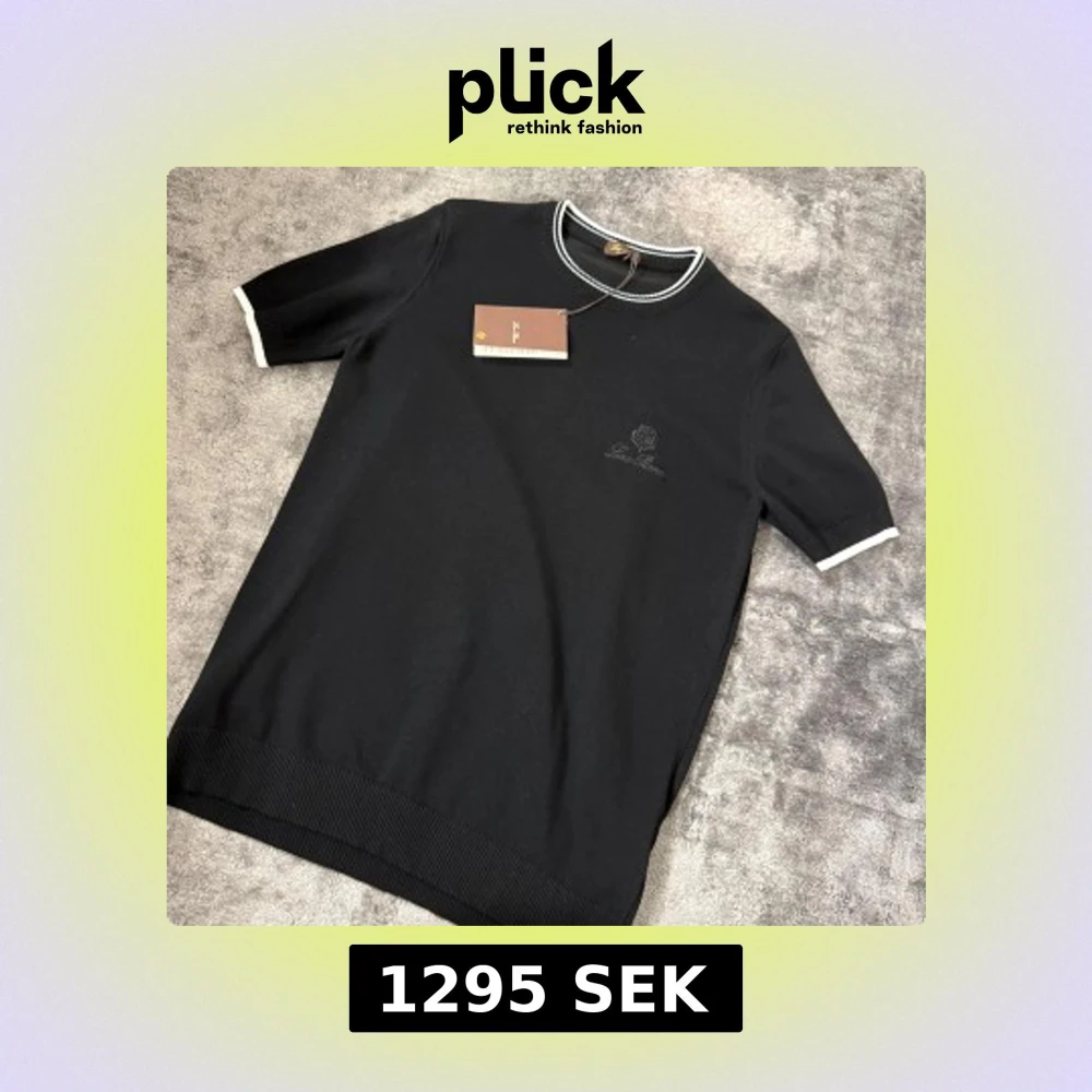 Svart t-shirt från Loro Piana med diskret broderad logga på bröstet. Rund hals med vit och svart ribbad kant, samt vita detaljer vid ärmslut. Klassisk och stilren design i mjuk bomull som känns lyxig mot huden. Perfekt för dig som gillar minimalistisk stil.