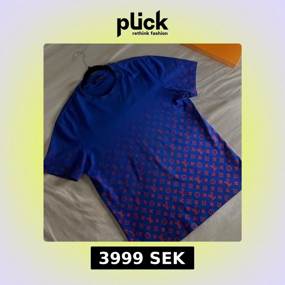 Snygg blå t-shirt med rött monogrammönster från Louis Vuitton. Perfekt för dig som vill sticka ut med stil. T-shirten har en klassisk passform och korta ärmar. Medföljer den klassiska orangea Louis Vuitton boxen till T-shirten!