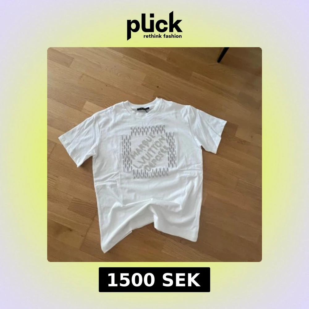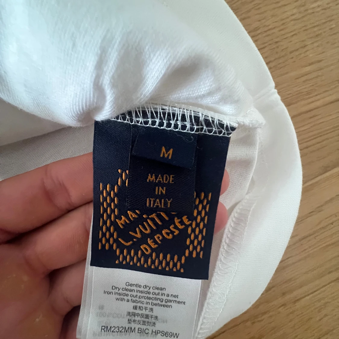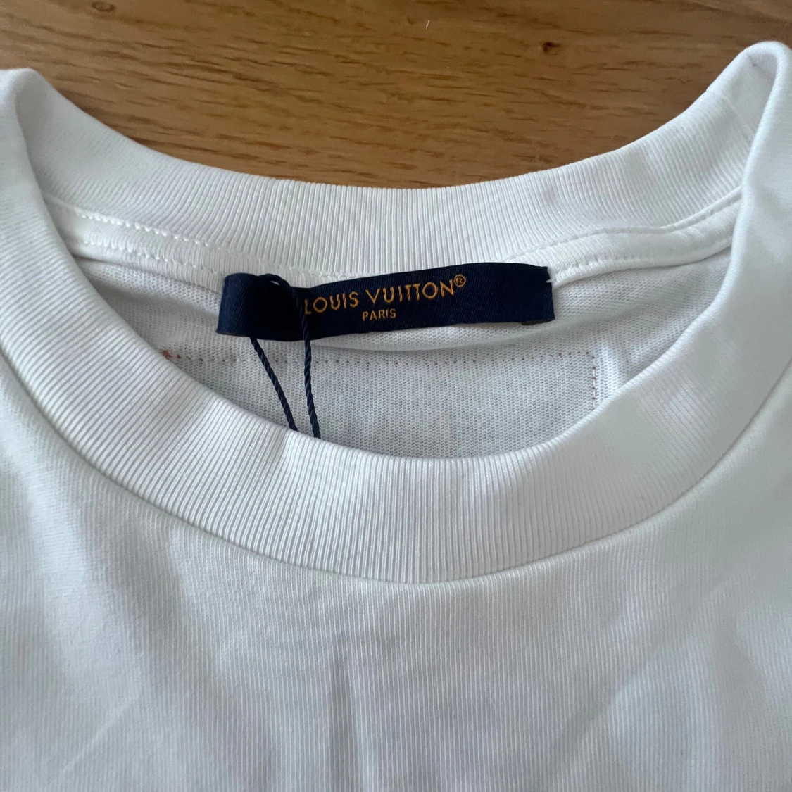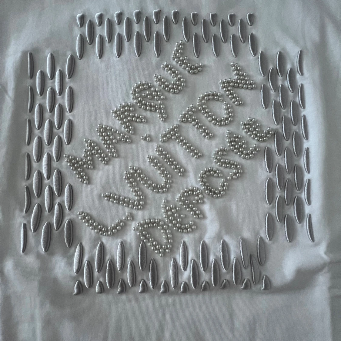 Exklusiv vit t-shirt från Louis Vuitton med korta ärmar. Framsidan har ett broderat mönster och text i pärlor som ger en lyxig känsla. Tillverkad i Italien i mjuk bomull. Perfekt för dig som vill sticka ut med designerplagg och coola detaljer.