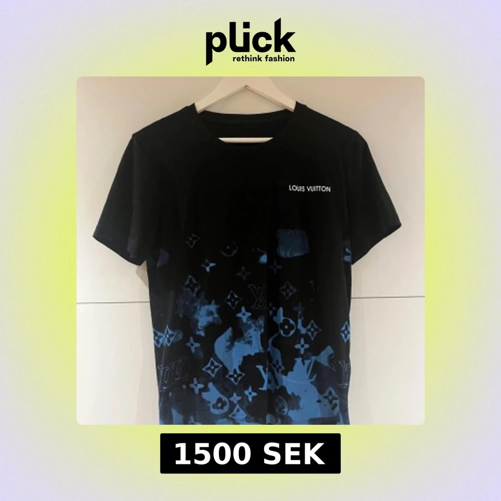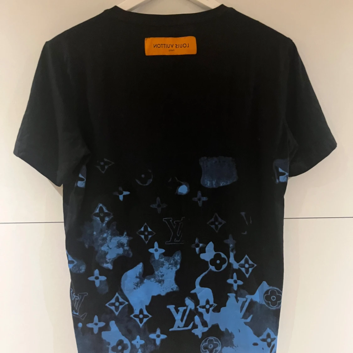 Svart t-shirt från Louis Vuitton med blått monogrammönster och coola färgfläckar nertill. Diskret Louis Vuitton-tryck på bröstet och gul etikett i nacken. Klassisk passform och korta ärmar, perfekt för dig som gillar streetstyle.