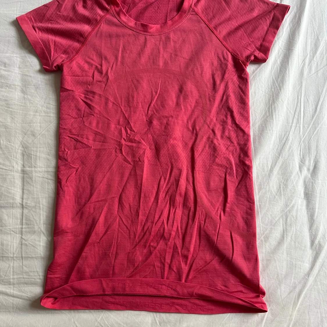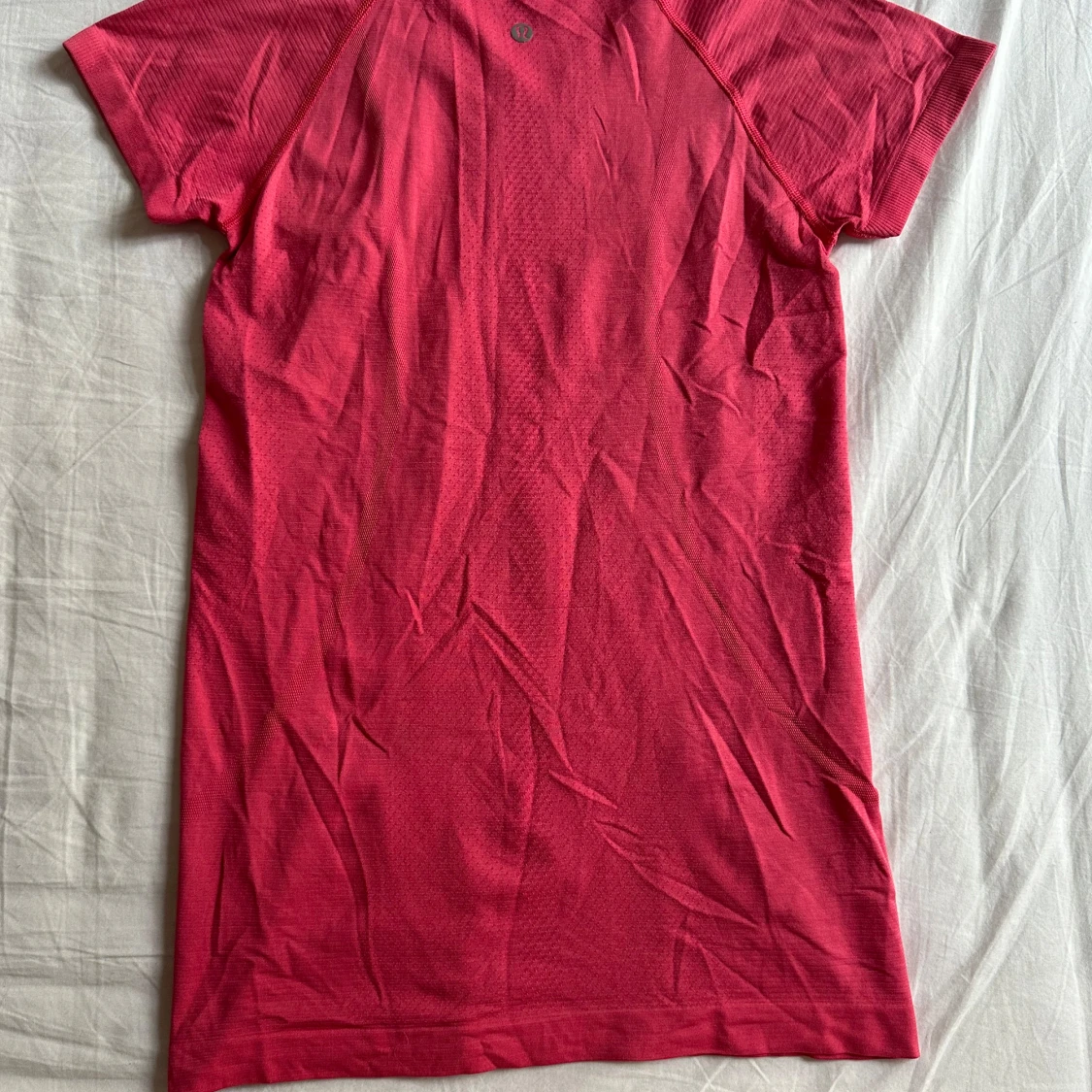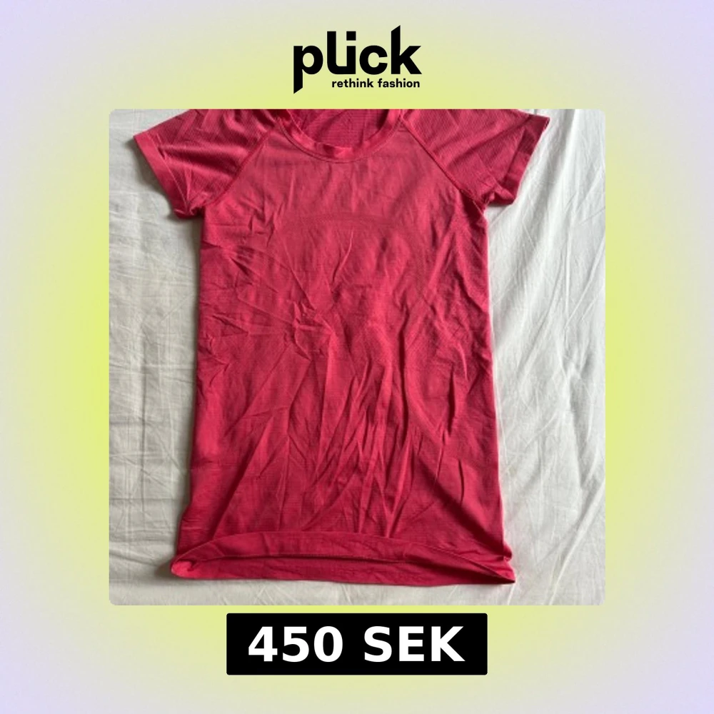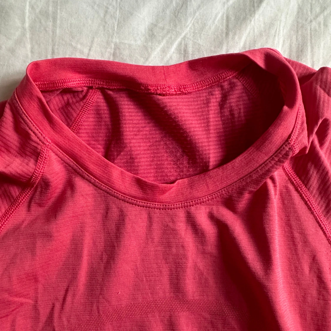 Snygg rosa t-shirt från Lululemon med korta ärmar och rund hals. Perfekt för träning med sitt lätta och stretchiga material. T-shirten har diskreta ränder på ärmarna och en tight passform som sitter skönt på kroppen.Har klippt av taggen på insidan