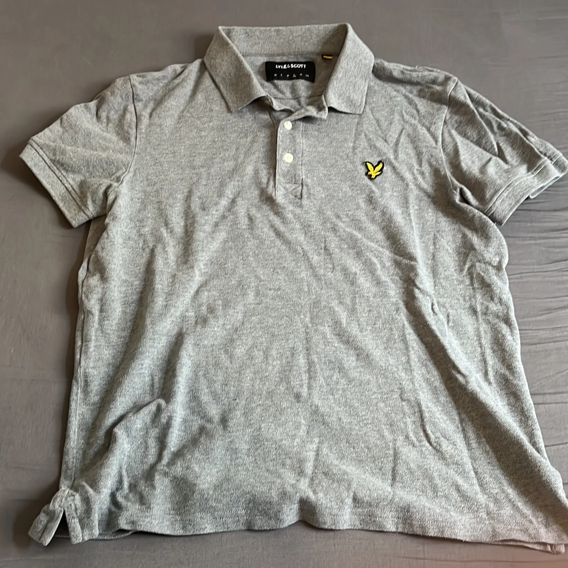 Snygg grå pikétröja från Lyle & Scott med klassisk krage och tre knappar framtill. Tröjan har det ikoniska gula fågel-loggan broderad på bröstet. Tillverkad i mjuk bomull som känns skön mot huden. Perfekt för en clean och stilren look. Hör av er vid minsta lilla fråga.