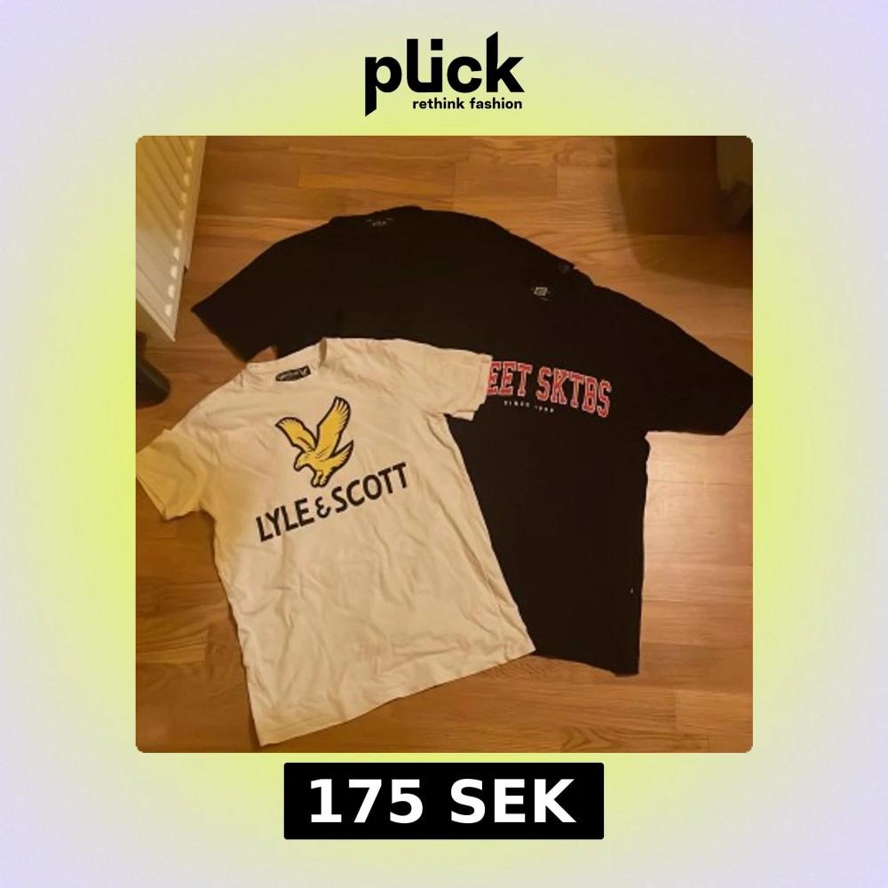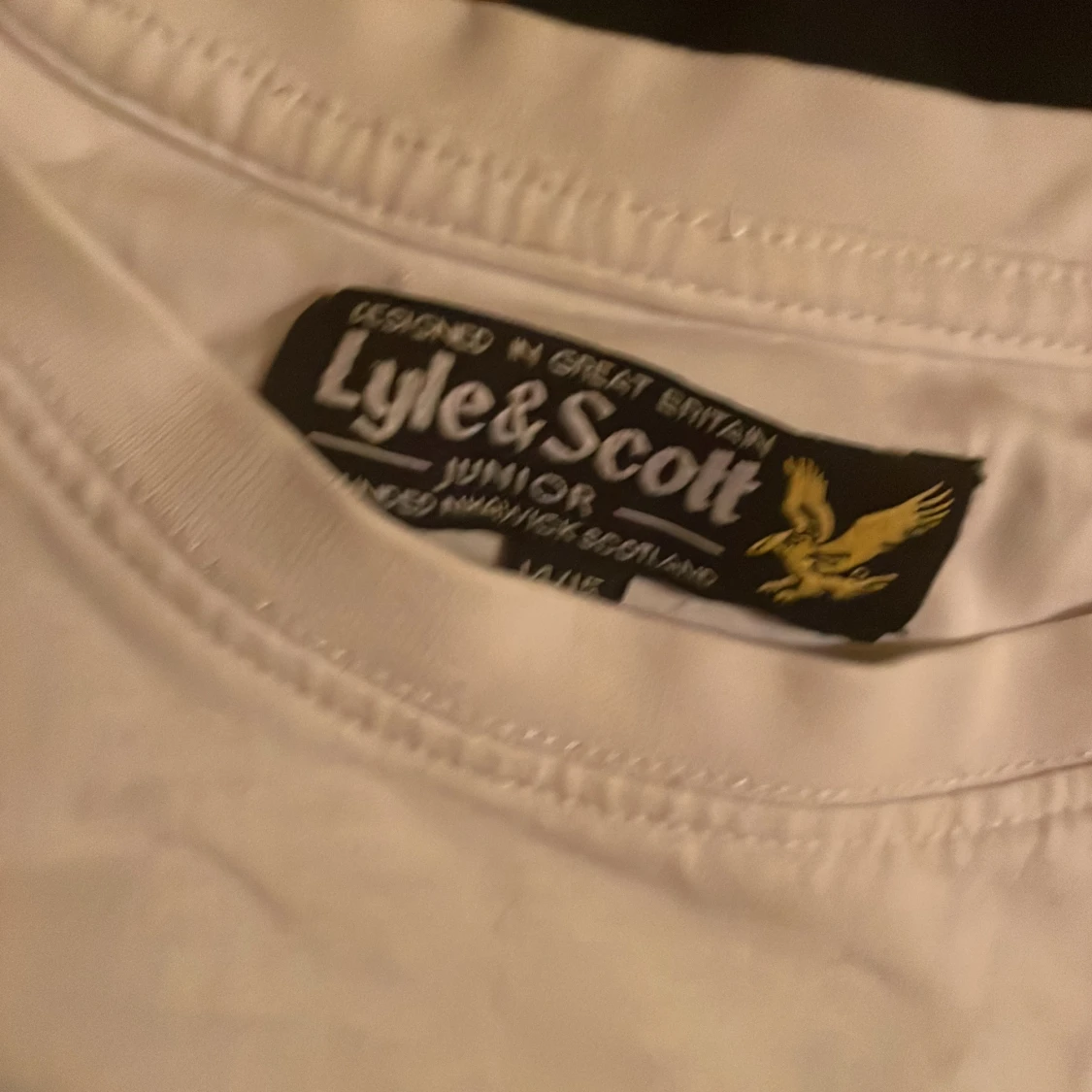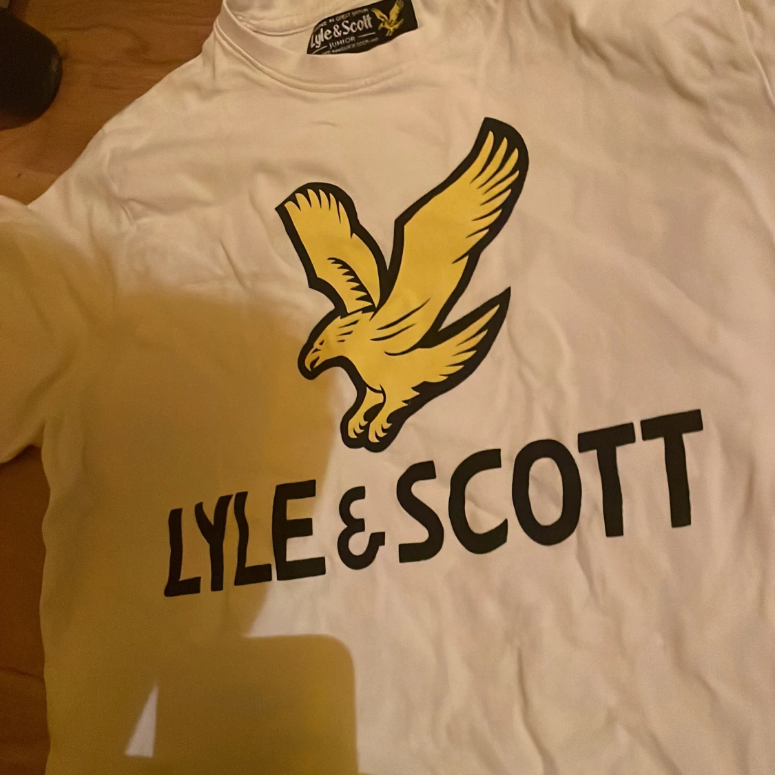 Vit t-shirt med stort gult fågeltryck och svart Lyle & Scott-logga på bröstet. Klassisk rund hals och korta ärmar. Perfekt för en avslappnad stil. Renar garderoben och hittade dessa plagg, försöker få in lite pengar till sommaren