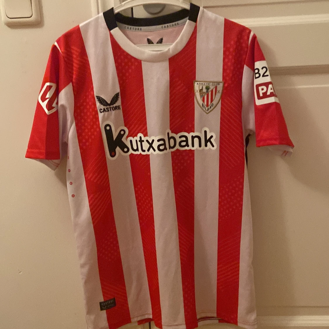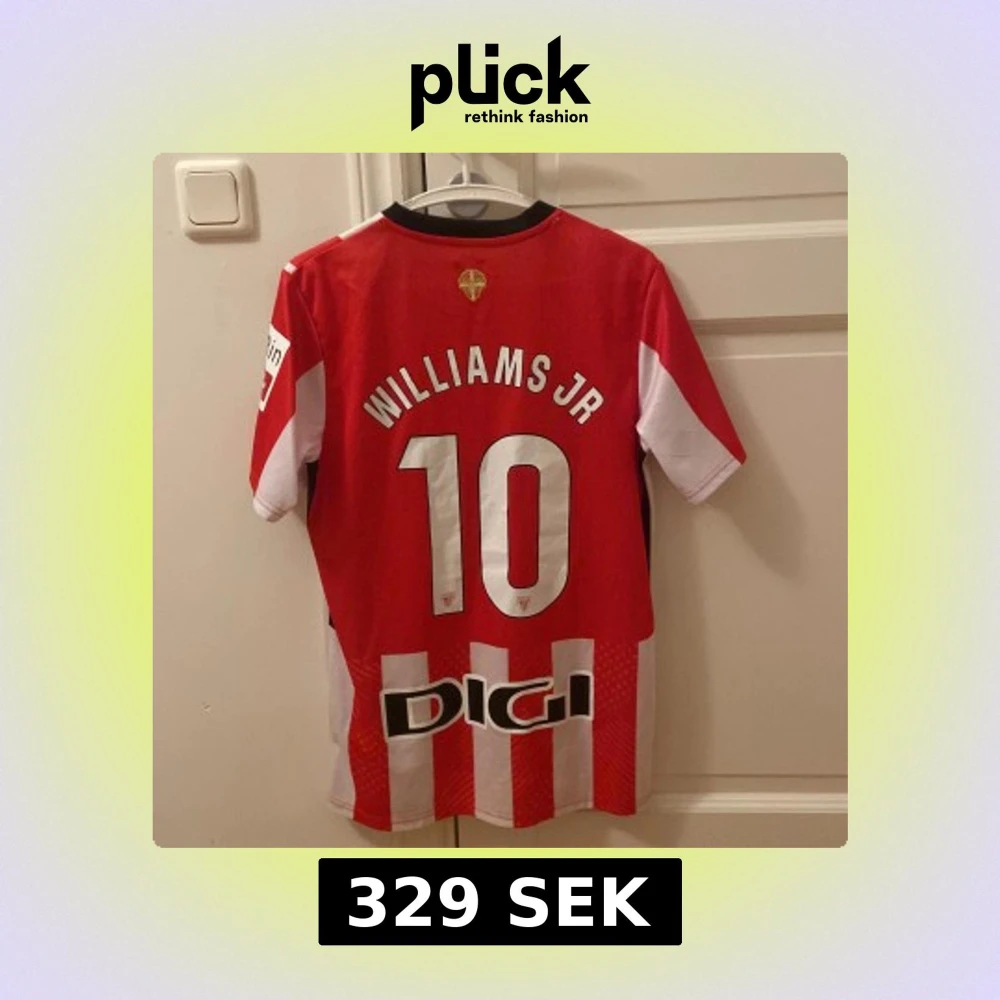 Säljer en Athletic Club Bilbao fotbollströja från Castore, med Williams Jr och nummer 10 på ryggen. Tröjan är röd och vit med breda vertikala ränder, svarta detaljer vid kragen och flera sponsorloggor. Tillverkad i lätt och ventilerande funktionsmaterial.