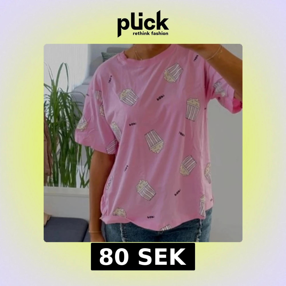 Säljer en söt rosa t-shirt med ett roligt popcornmönster. T-shirten har en avslappnad passform och korta ärmar, perfekt för en casual look. Perfekt för filmkvällar eller bara för att liva upp vardagen! 🍿