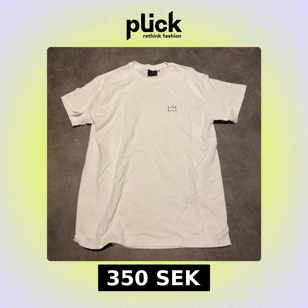 Säljer en vit t-shirt med ett litet kronmotiv på framsidan och ett stort turnétryck på baksidan. T-shirten har korta ärmar och en normal passform. Perfekt för dig som gillar enkel och stilren design med en twist. Om någon vill köpa så kan jag stryka den innan jag skickar iväg den😊💕