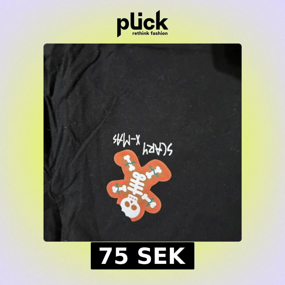 Svart t-shirt med ett färgglatt tryck av en pepparkaksgubbe med skelett och texten 'Scary X-Mas' på bröstet. Perfekt för dig som gillar unika och lite edgy motiv. Klassisk passform och rund hals.