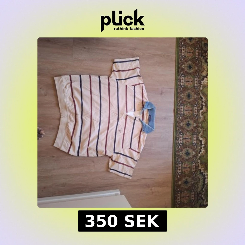Säljer en beige pikétröja med blå denimkrage och knäppning framtill. Tröjan har horisontella ränder i blått och rött, samt korta ärmar. Perfekt för en avslappnad och stilren look.
