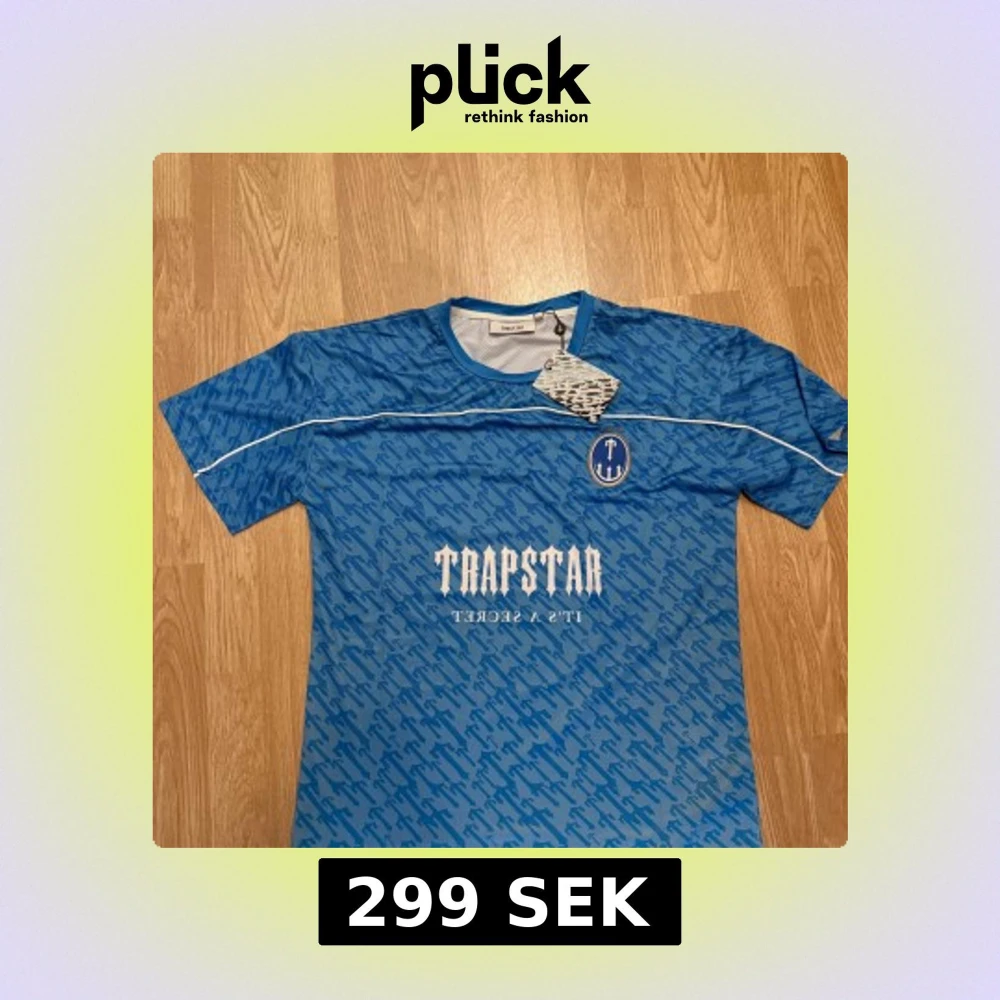 Snygg blå fotbollströja från Trapstar med vit logga och text på bröstet samt siffran 22 på ryggen. Tröjan har ett randigt mönster i blå toner, korta ärmar och vita detaljer längs axlarna. Perfekt för dig som vill sticka ut på planen eller gatan.