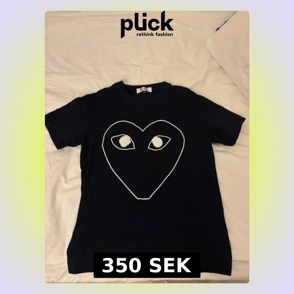 Marin blå t-shirt från Comme des Garçons Play med stort vitt hjärta och ögon tryckt på framsidan. Klassisk rund hals och korta ärmar. Materialet är mjuk bomull som känns skön mot huden. Perfekt för dig som gillar statement-plagg och ikoniska designer. Den är i storlek M men sitter mer som S. Tshirten är använd 2 gånger.