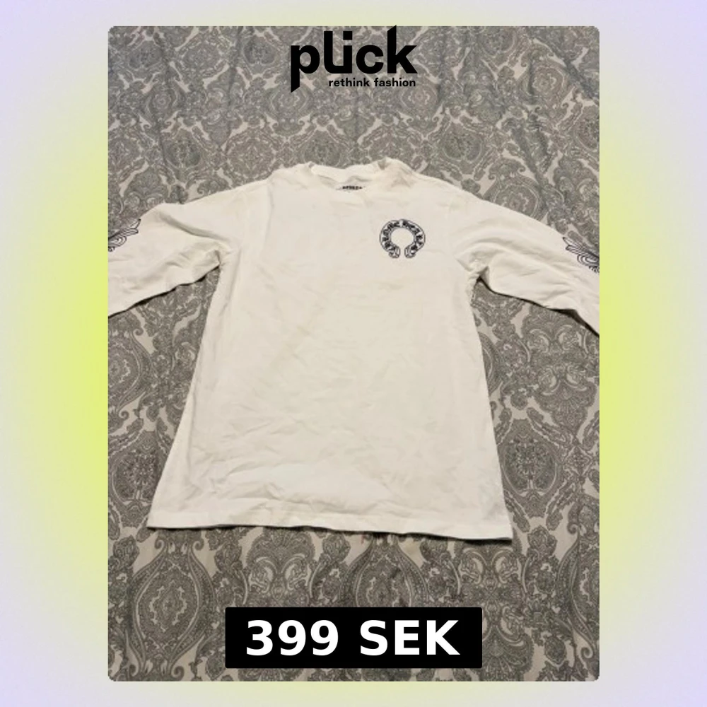 Vit långärmad t-shirt från Chrome Hearts med svart tryck på bröstet och längs ena ärmen. Tröjan har en avslappnad passform och är tillverkad i mjuk bomull. Perfekt för dig som gillar streetwear och snygga detaljer.