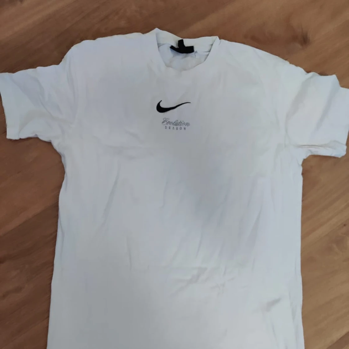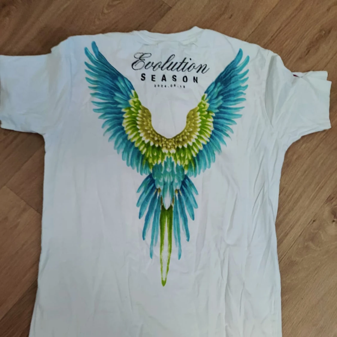 Vit t-shirt från Evolution Season med svart logga och text framtill. På ryggen finns ett stort, färgstarkt tryck av blå, gröna och gula vingar samt texten 'Evolution Season'. T-shirten har rund hals och korta ärmar, perfekt för dig som gillar unika prints.