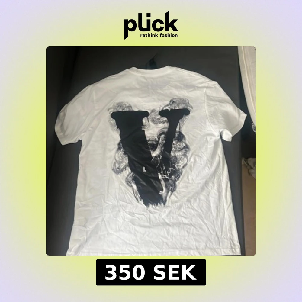 Säljer en vit t-shirt från VLONE i bomull med stor svart V-tryck på ryggen och coolt motiv med text och skelettängel på bröstet. Skön passform och streetwear-vibe, perfekt för dig som gillar unika prints och snygga detaljer.