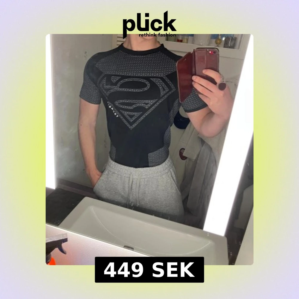 Säljer en svart och grå t-shirt från YoungLA med stort Superman-logga på bröstet. T-shirten har korta ärmar och är slim fit med coolt mönster på axlar och sidor. Materialet är polyester, perfekt för gymmet eller träning. Snygg och sportig vibe!
