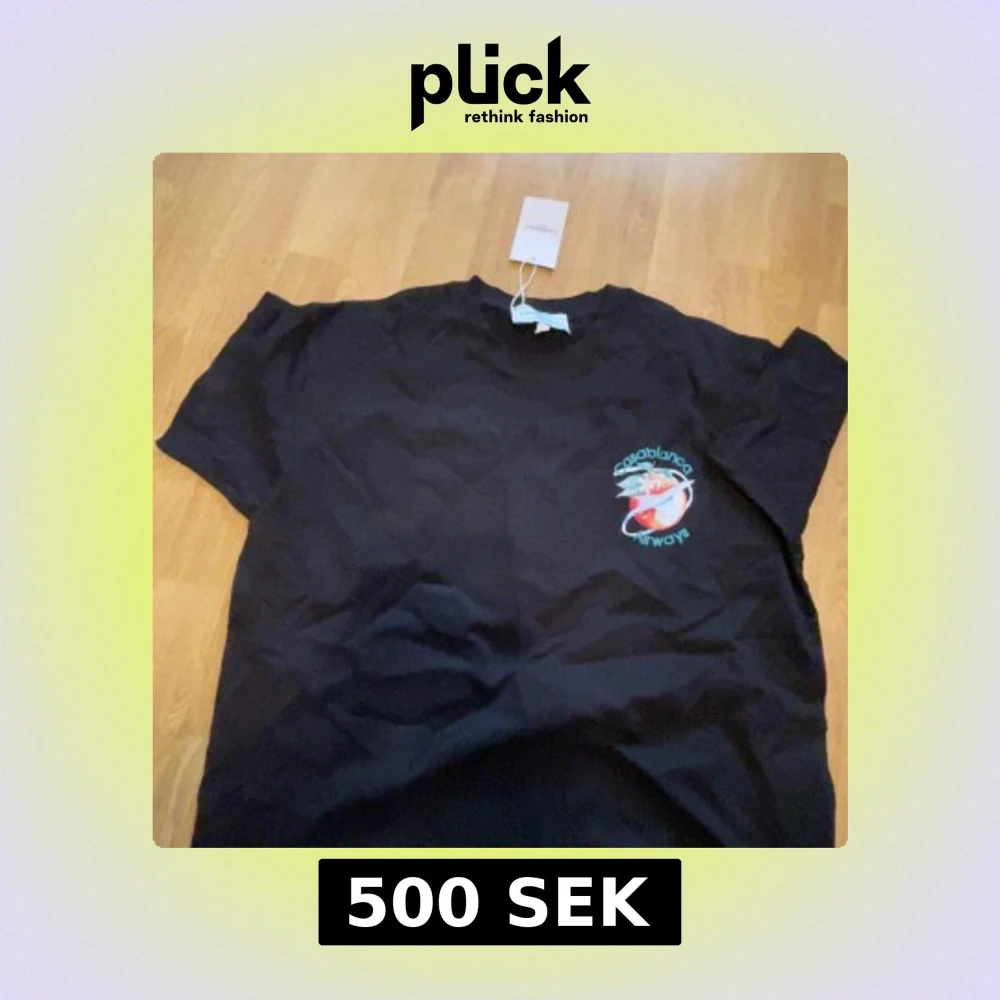 Svart t-shirt från Casablanca med färgglatt tryck av ett flygplan och frukt på bröstet och ryggen. Oversized passform och klassisk rund hals. Perfekt för dig som vill sticka ut med en cool och unik design.