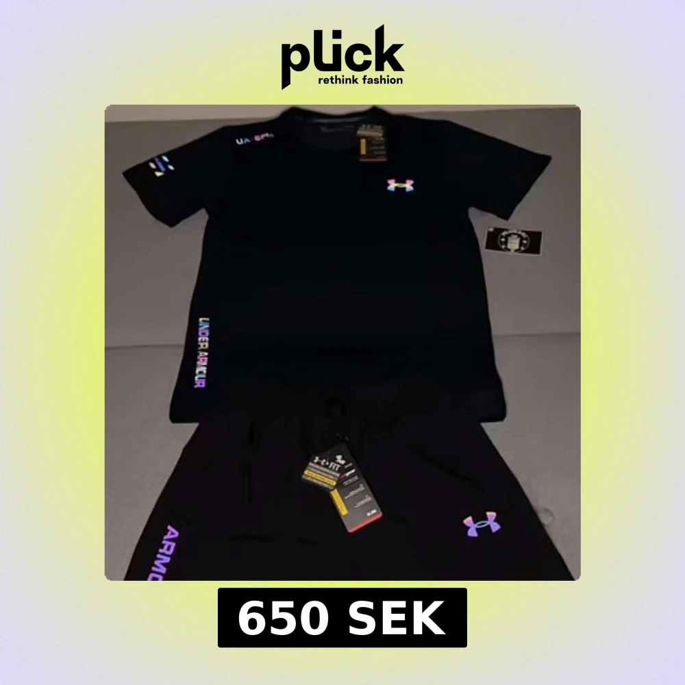 Svart t-shirt och shorts från Under Armour med kort ärm och färgglada loggor på bröstet och ärmen. Snyggt tryck med märkesnamnet längs sidan. Perfekt för dig som gillar sportig och clean stil. Materialet känns lätt och andas bra. Helt oanvänd